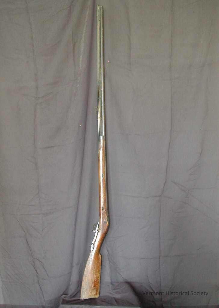 Long, muzzle-loading musket. The musket fires with a flintlock mechanism. The lock plate is marked, "DUBLIN CASTLE" and has a royal crown with the initials GR.