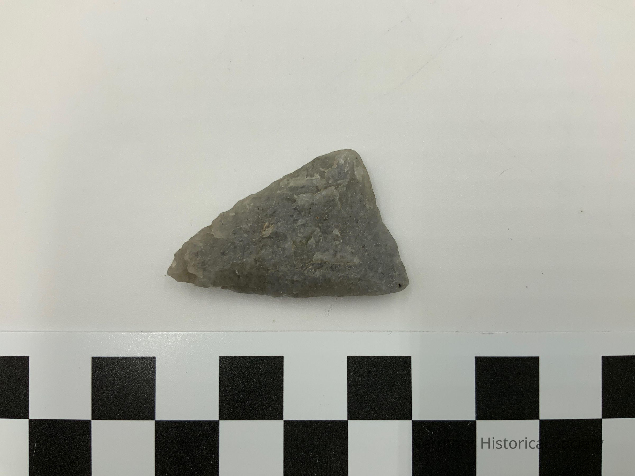 Triangular grey chipped stone projectile.