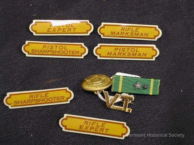 Collection of eight pins and one button. Six pins are plastic bars with yellow grounds and the inscriptions, "PISTOL EXPERT", "PISTOL SHARPSHOOTER", "PISTOL MARKSMAN", "RIFLE EXPERT", "RIFLER SHARPSHOOTER", and "RIFLE MARKSMAN". One pin is metal and formed into the shape of the letters "VT." One pin is a bar pin wrapped in green grosgrain ribbon with yellow stripes on either side and two metal 5-pointed stars. The Button is a gold-toned button with the insignia of the Vermont State Guard (a stag's head).Context