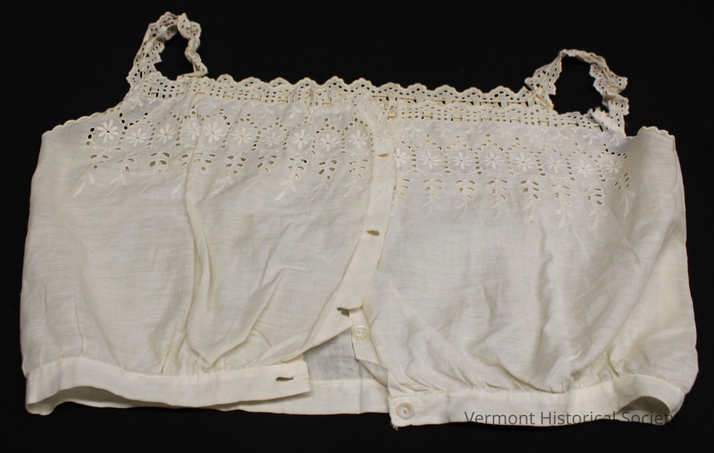White cotton corset cover. It consists of a rectangular bodice panel gathered into a waistband with a buttoned opening along the center back. The top is decorated with machine-made eyelet embroidery, and eyelet ribbon is used to form shoulder straps.