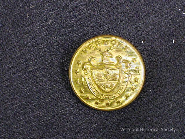 Gold-toned button molded with the Vermont state seal, motto ("Freedom & Unity"), the word "VERMONT", and 13 stars.