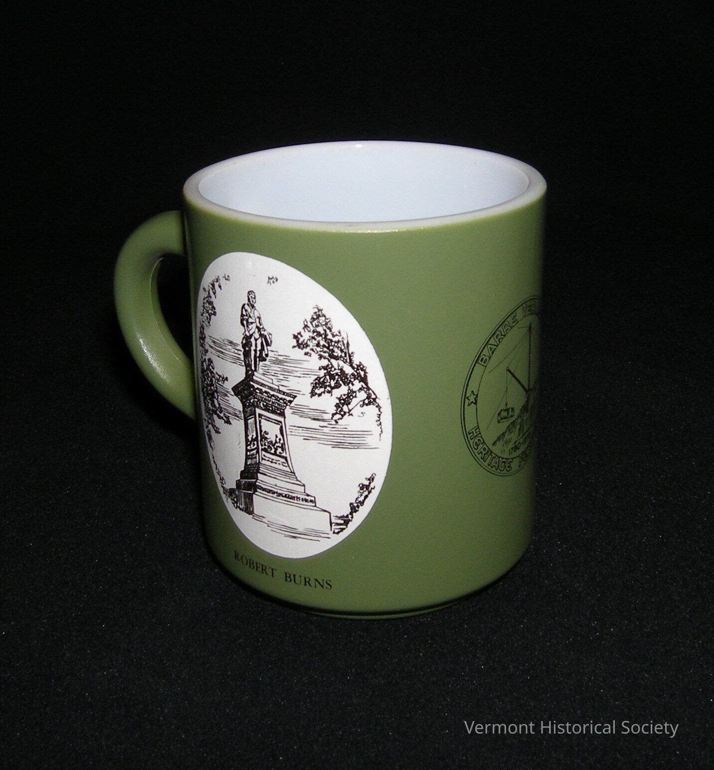 Opaque, white glass coffee mug with a printed green wrap on the exterior. Within two white ovals on either side of the mug are line drawings of monuments. One is labeled, "ROBERT BURNS", and the other is labeled, "YOUTH TRIUMPHANT". Between the two ovals is a circular logo showing a crane in a quarry with the words, "BARRE VERMONT / HERITAGE FESTIVAL".Context