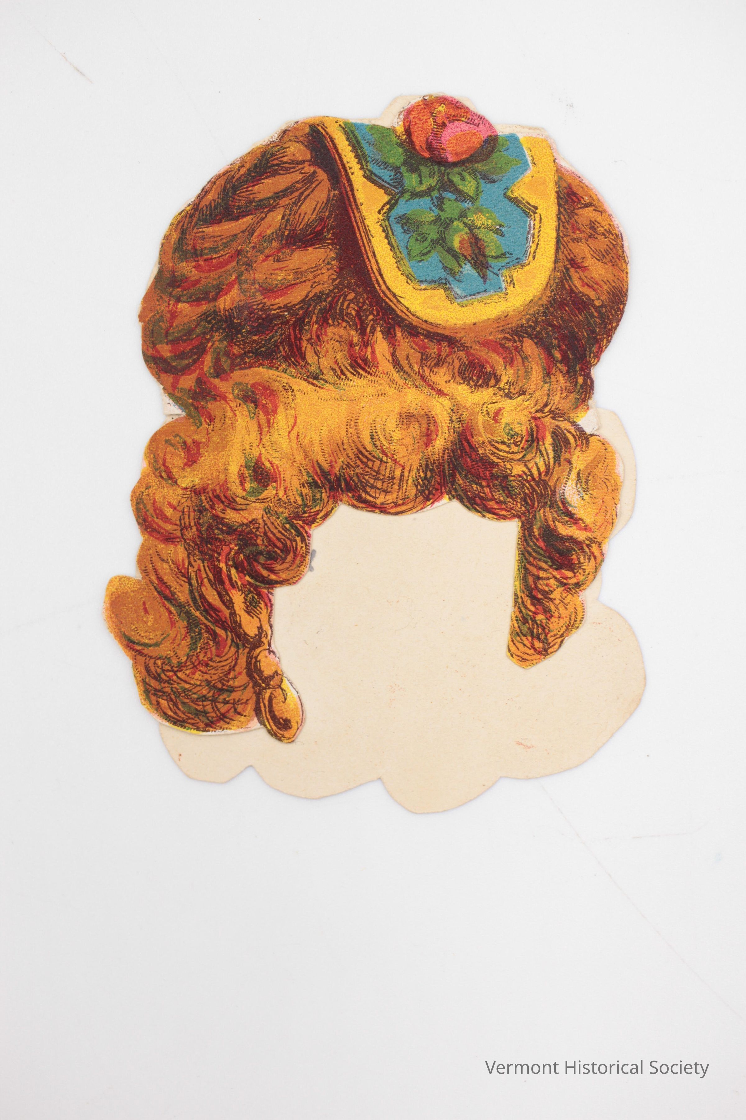Two-sided wig for a paper doll. This wig has curly red-blonde hair with a turban-style hat on the top. A blue and yellow ribbon is draped across the top. The reverse shows the same wig from the back.