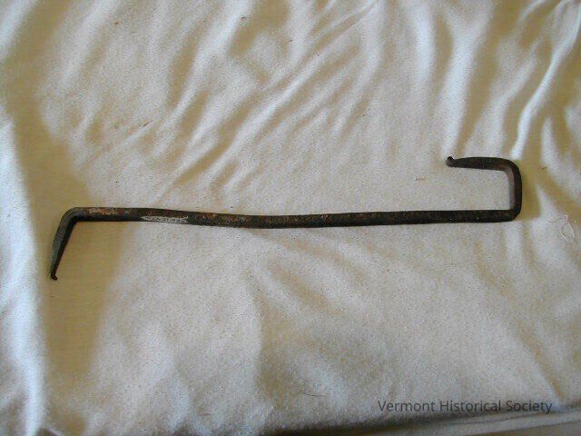 Ceiling hook made from a metal rod. One end is bent perpendicular to the shaft, and the other end is bent into a U shape.