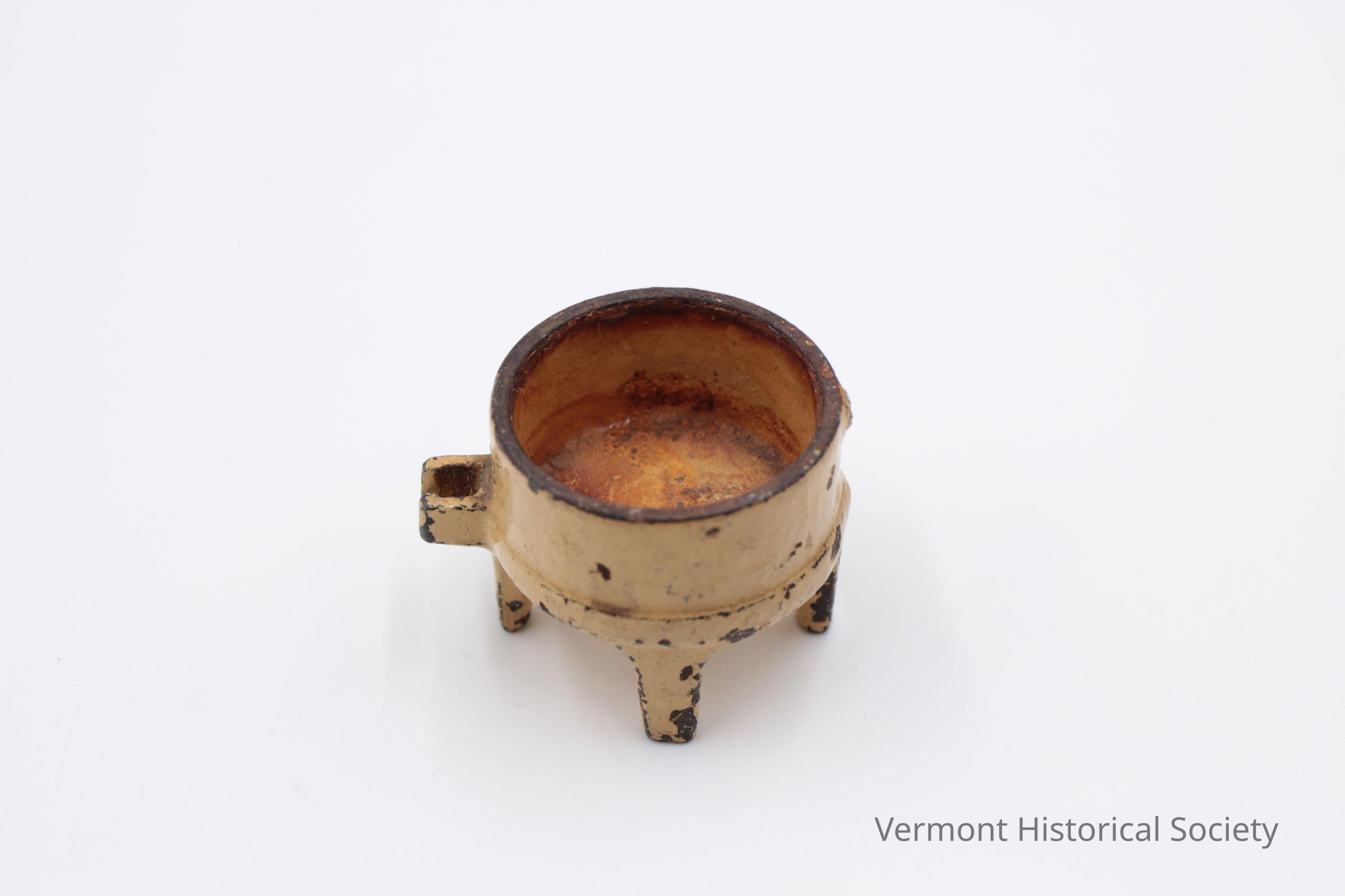 Fragment of a miniature washing machine sized for a dollhouse. The piece is made from cast iron and painted yellow. It consists of the lower washbasin section of an early washing machine.Context