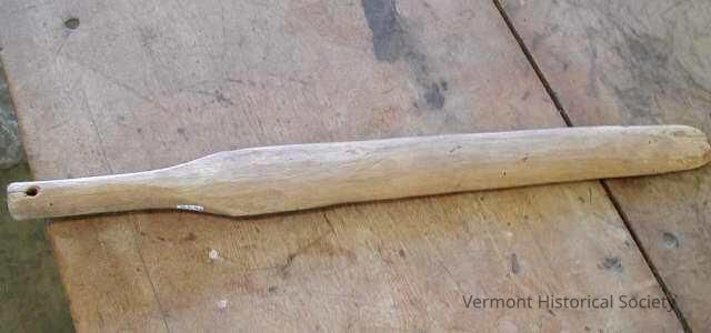 Flaxbreaker, solid wood, one piece, hand made. Handle has hole drilled through it for hanging. By carefully looking, you can see the marks of the carver.