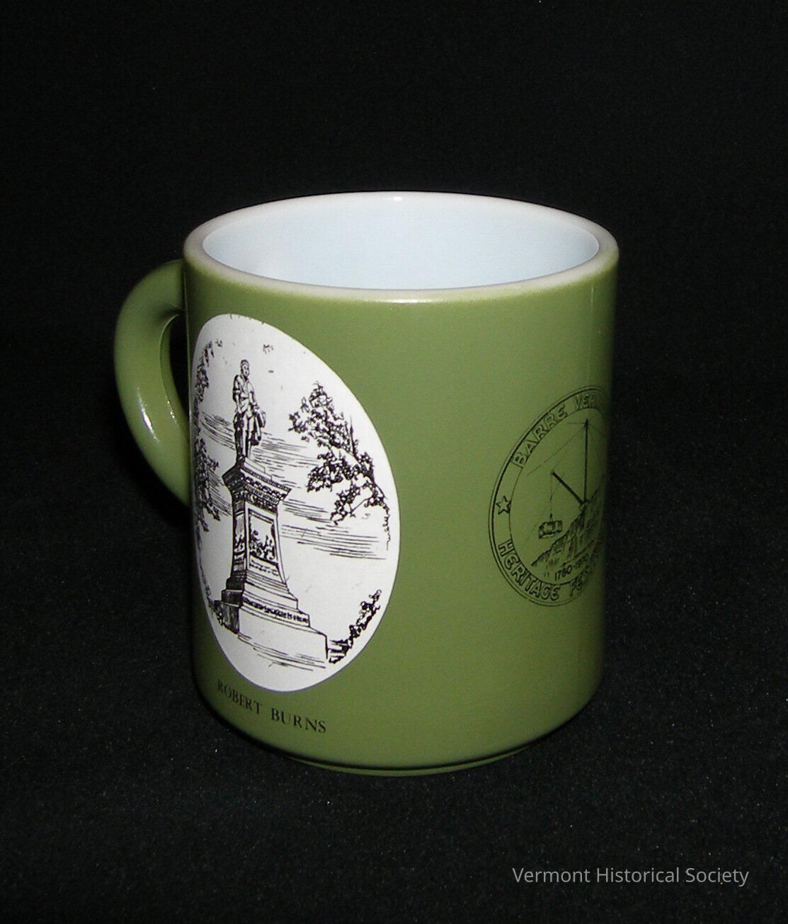 Opaque, white glass coffee mug with a printed green wrap on the exterior. Within two white ovals on either side of the mug are line drawings of monuments. One is labeled, "ROBERT BURNS", and the other is labeled, "YOUTH TRIUMPHANT". Between the two ovals is a circular logo showing a crane in a quarry with the words, "BARRE VERMONT / HERITAGE FESTIVAL".Context