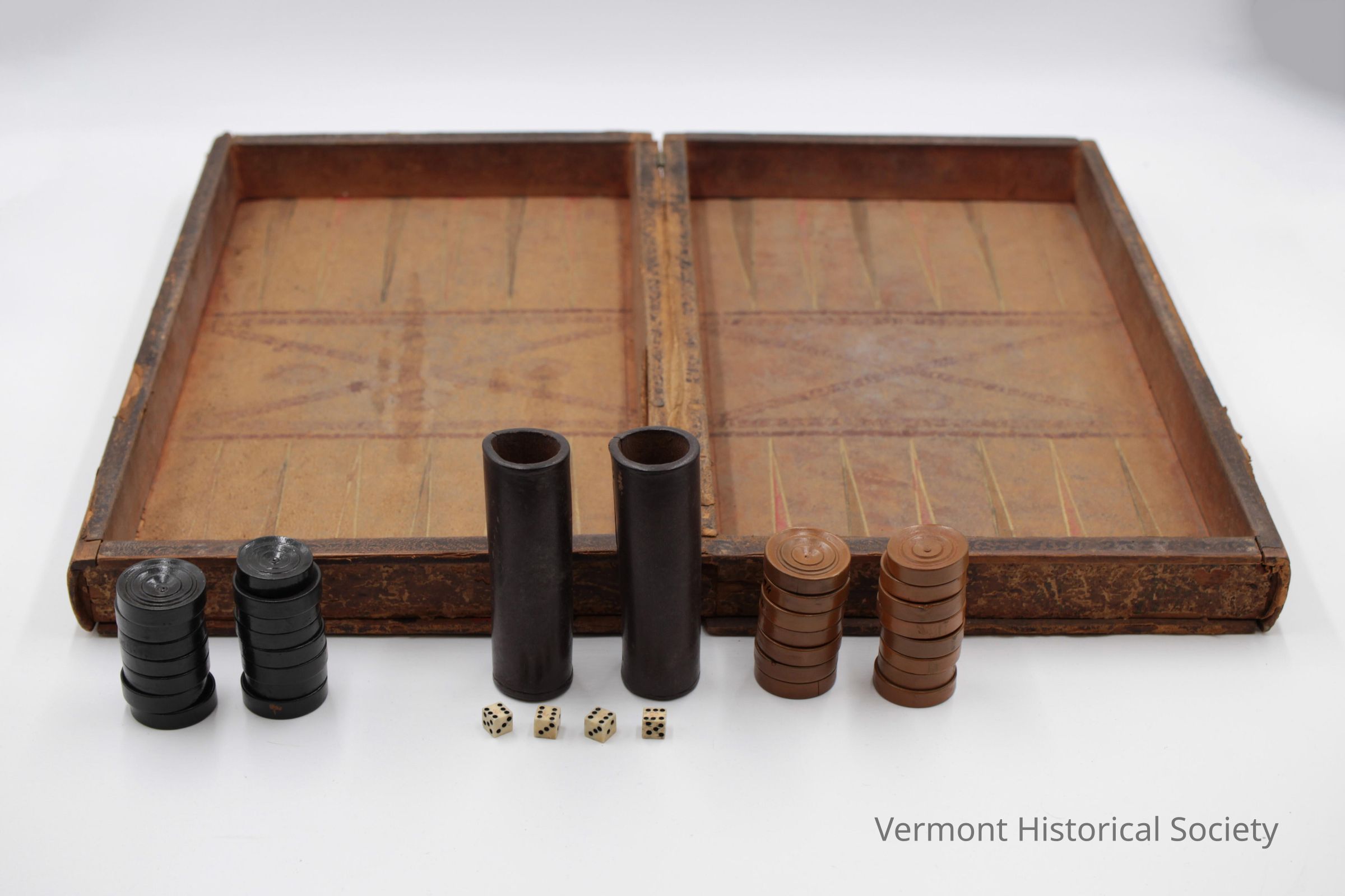 Backgammon set. The set is contained within a box that opens to reveal a backgammon board on the inside and a checkerboard on the outside. The edges of the box are decorated to disguise is as two side-by-side books, with three edges looking like pages and one edge looking like the two spines. The box is entirely covered in leather, inside an out, and all decoration is tooled and painted on the leather. The spine of one "book" is labeled "HIST. OF ENGLAND". The leather has been completely removed from the other spine. The hinge of the box is on the side opposite the spines.