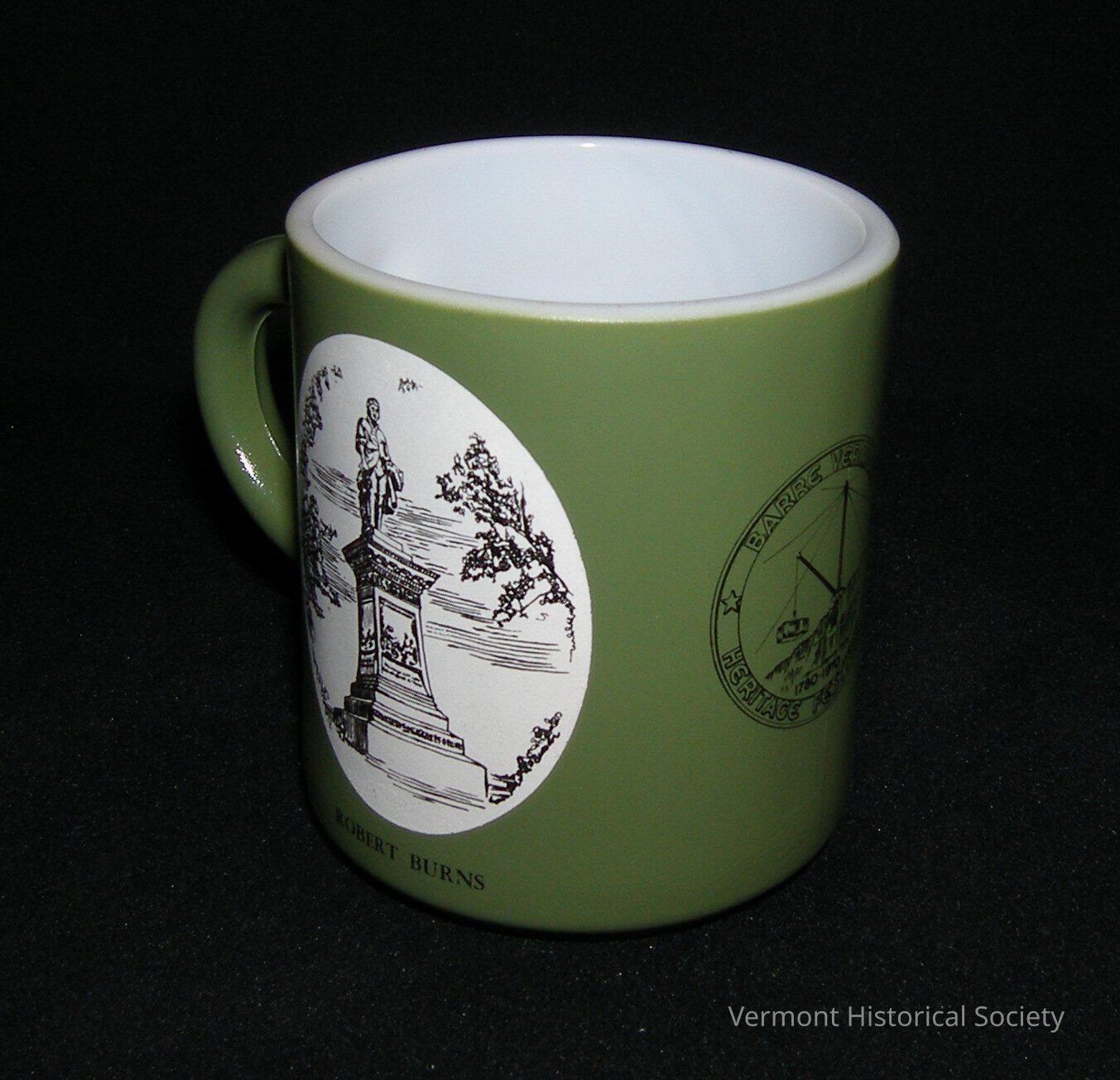 Opaque, white glass coffee mug with a printed green wrap on the exterior. Within two white ovals on either side of the mug are line drawings of monuments. One is labeled, "ROBERT BURNS", and the other is labeled, "YOUTH TRIUMPHANT". Between the two ovals is a circular logo showing a crane in a quarry with the words, "BARRE VERMONT / HERITAGE FESTIVAL".Context