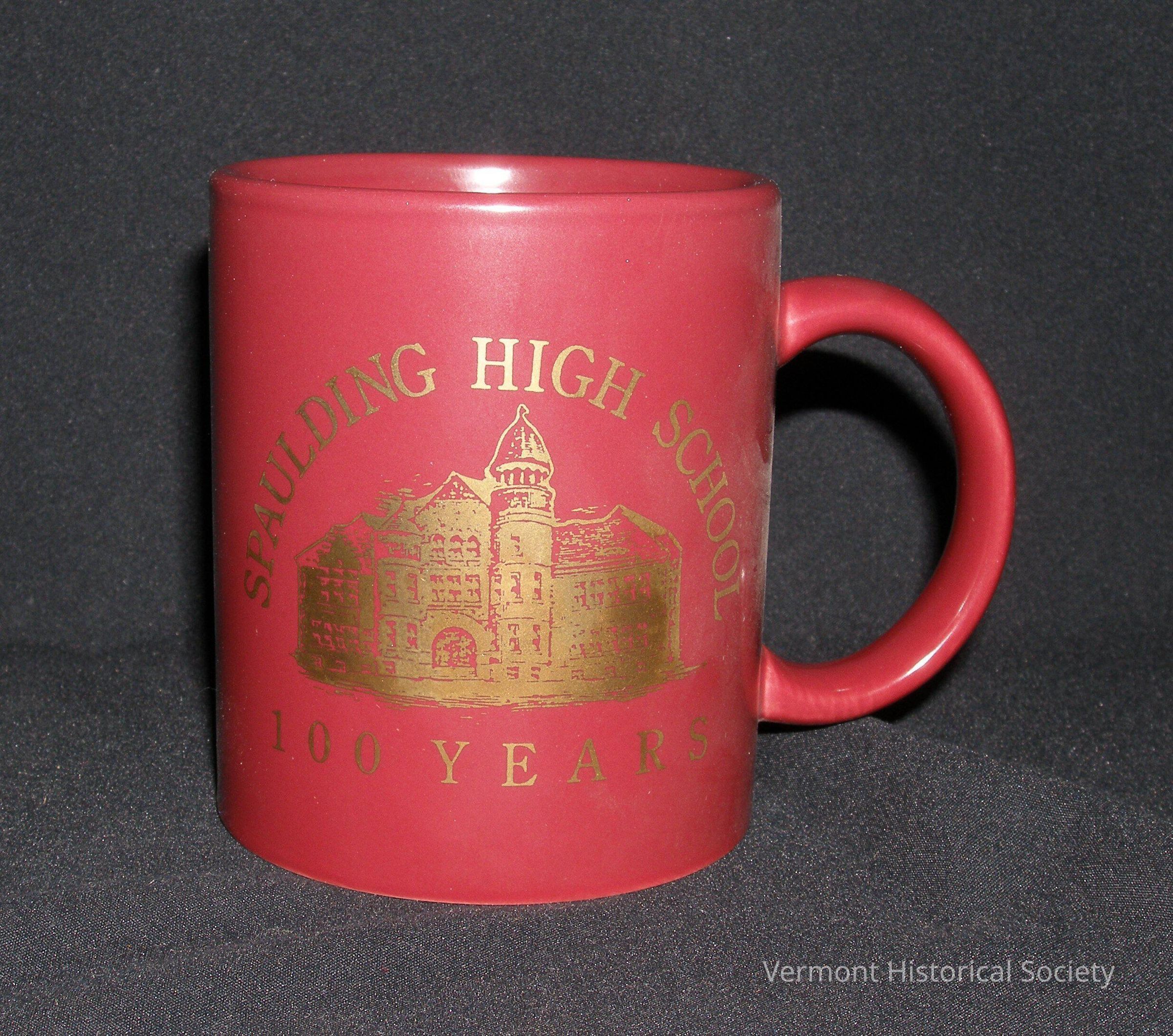 Straight-sided maroon coffee mug printed in gold with an image of a large, Victorian building with multiple towers and the inscription, "SPAULDING HIGH SCHOOL 100 YEARS".Context