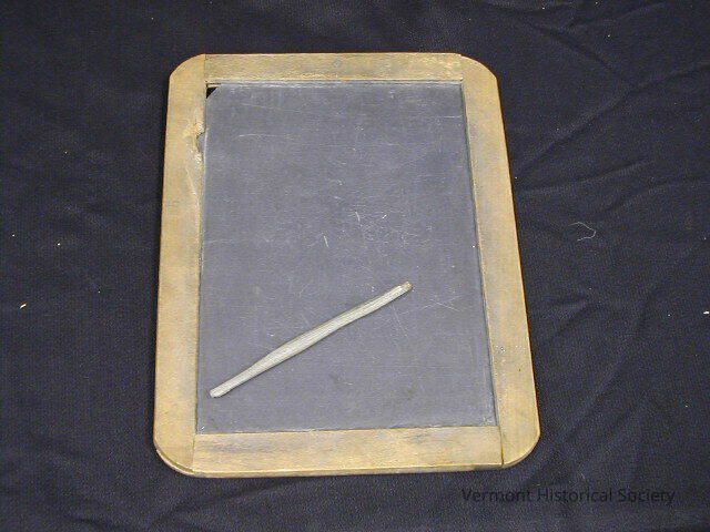 Writing slate consisting of a flat, rectangular piece of black slate inserted into a wooden frame with rounded corners.