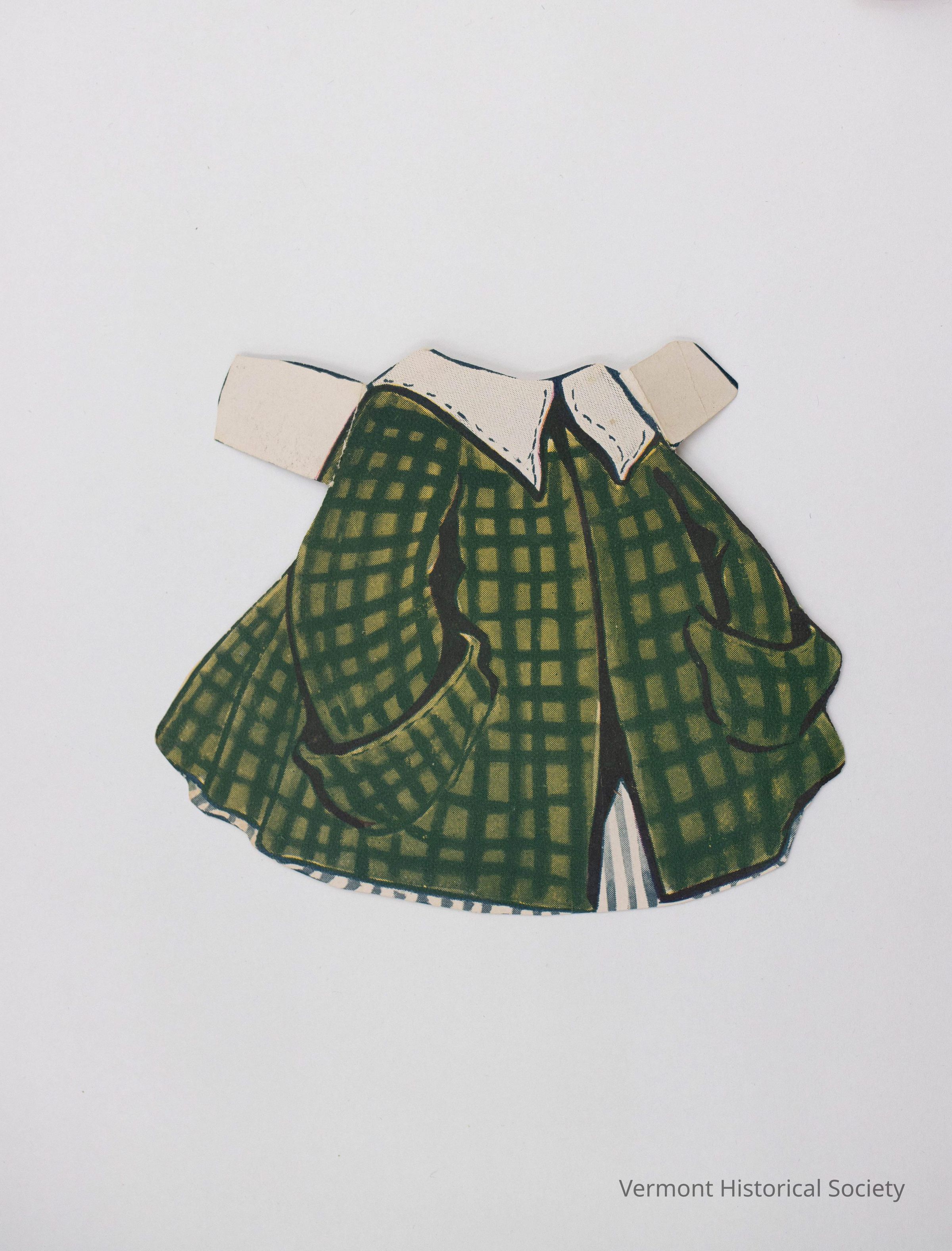 Printed paper coat for a paper doll. The coat is green plaid with a white pointed collar. The back shows a portion of a sales catalog page.Context