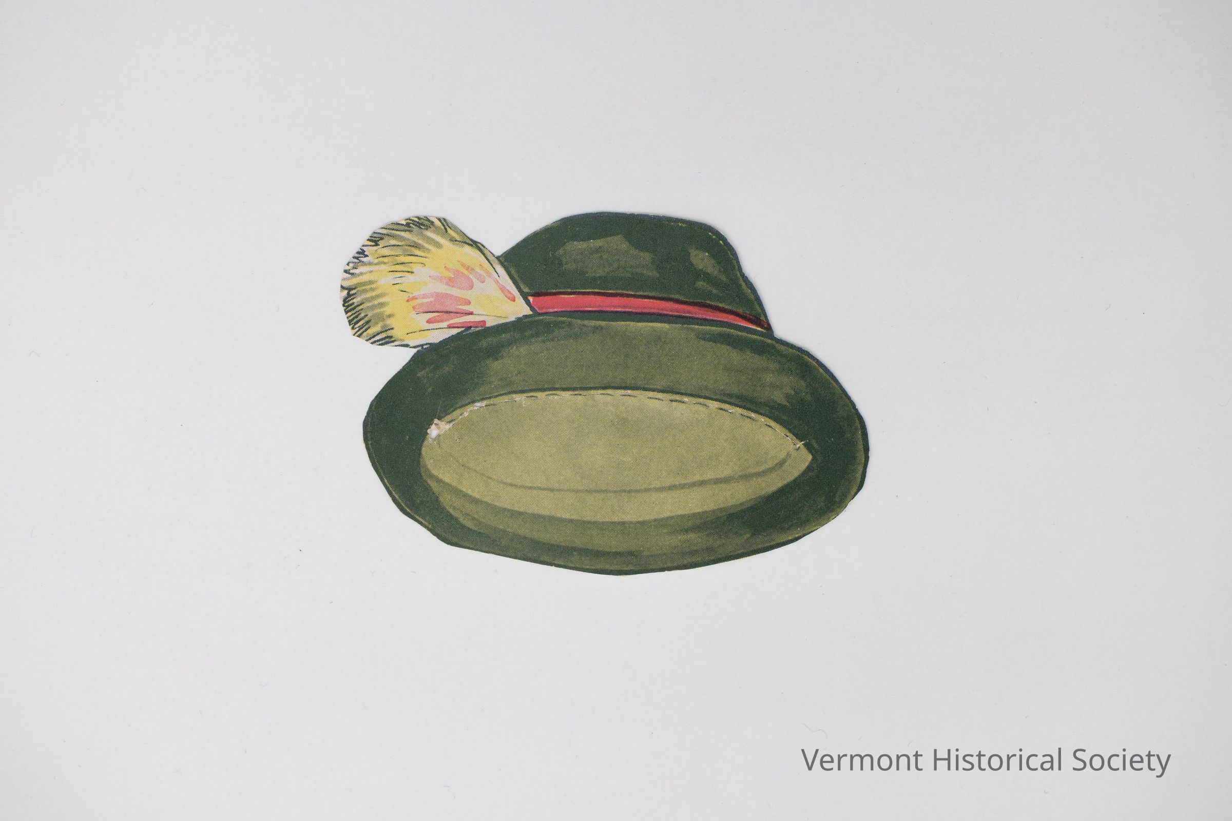 Green, printed paper hat for a paper doll decorated with a yellow feather at the base of the crown. The back shows a portion of a sales catalog page.Context