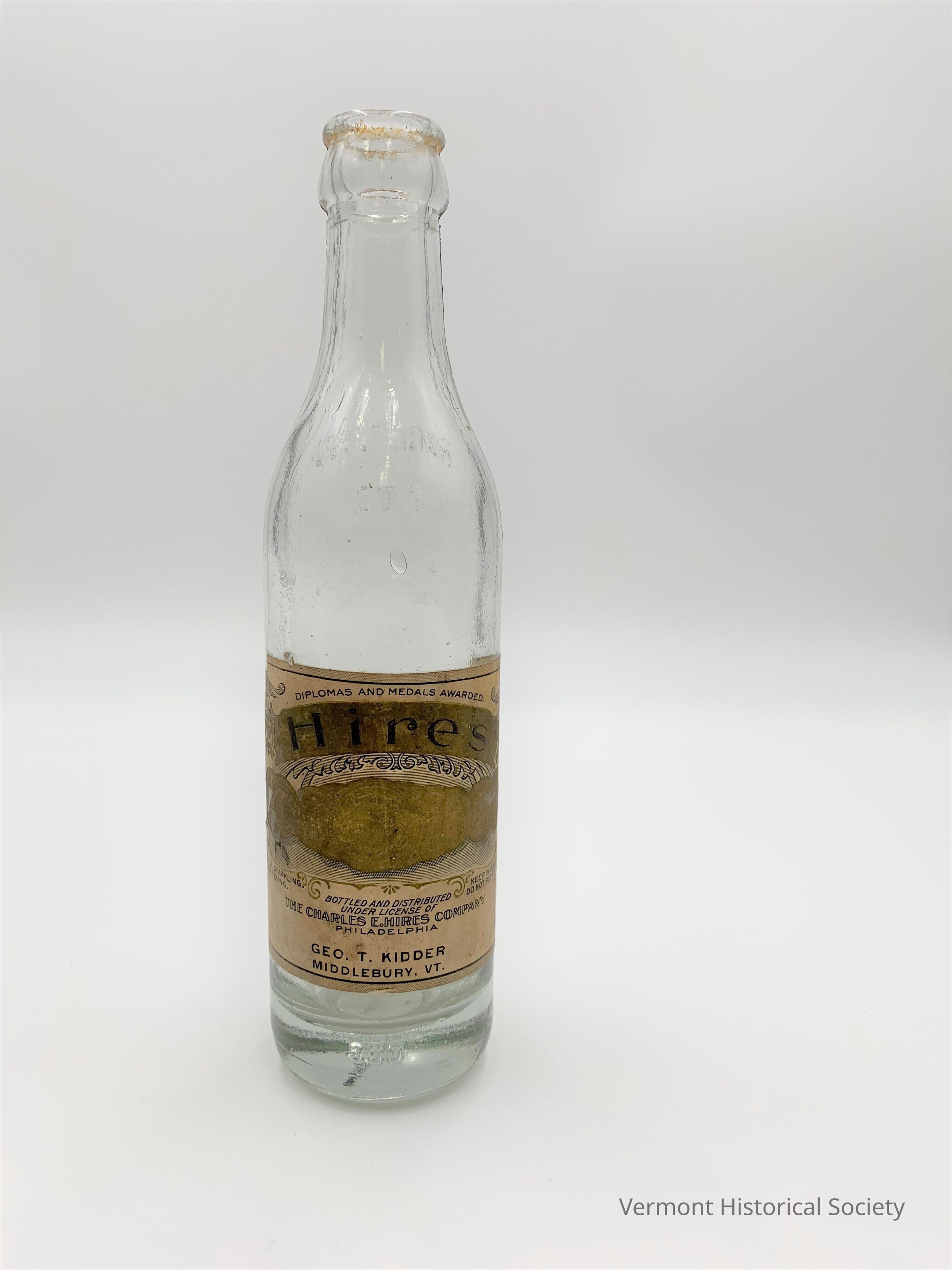 Clear glass soda bottle molded with the letter K on one side and a paper label on the opposite side. The paper label "Hires" along with the bottling and manufacturing information.