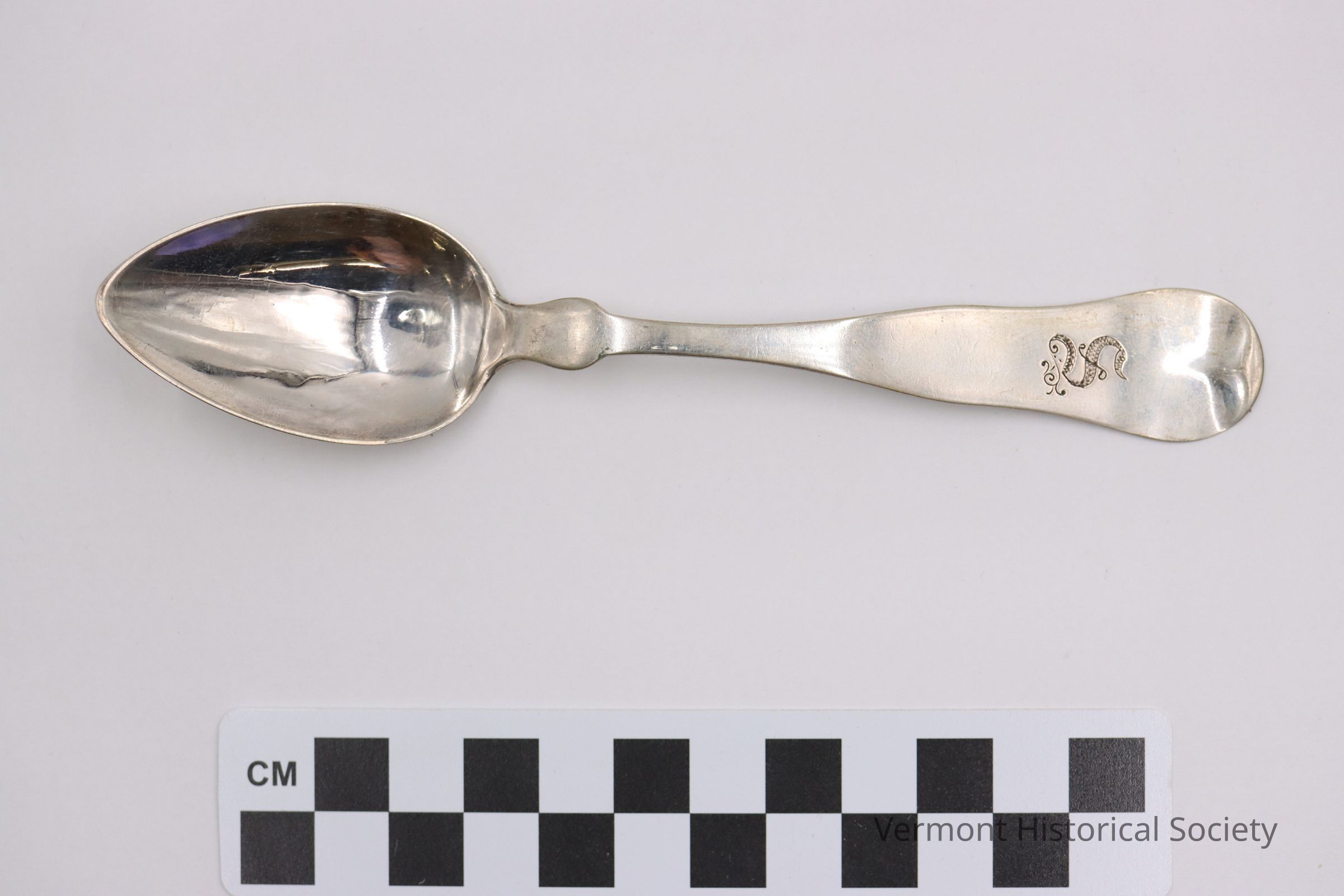 Silver teaspoon with rounded shoulder. The handle is engraved with the letter S in gothic script. The back of the handle is marked, "A. A. MEAD".