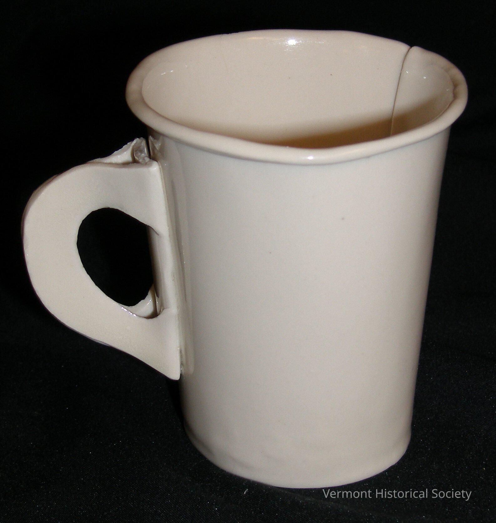 White porcelain figurine in the shape of a paper "to go" cup. The thin-bodied cup has a rolled rim and a prominent seam. The applied handle consists of two ear-shaped tabs attached together away from the cup and to a rectangular piece against the cup. The bottom is marked in blue, "THE AMERICAN APPLIE PIE COMPANY" with a blue wedge covered in white stars.