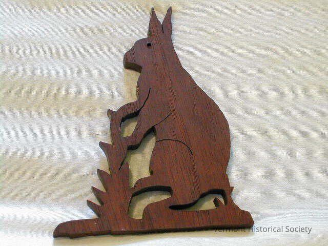 Two-dimensional carving of a rabbit in dark wood. The rabbit is shown on its hind legs, with its front legs on a tall piece of grass.Context