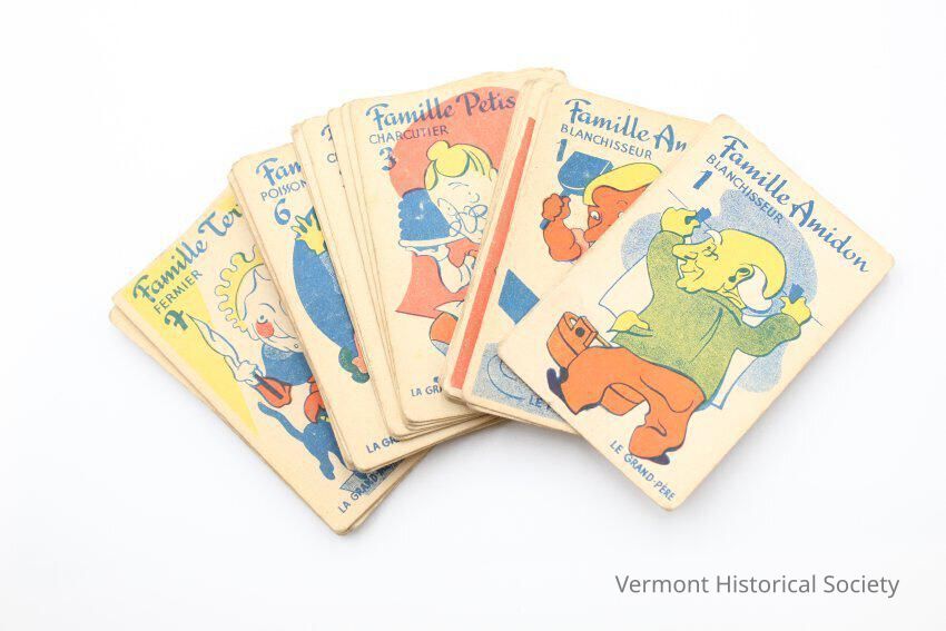 A deck of 30 cards for a game called "Famille Amidon." The pictures seem to show various occupations for family members. The grandfather, for example, is hanging up wash.Context