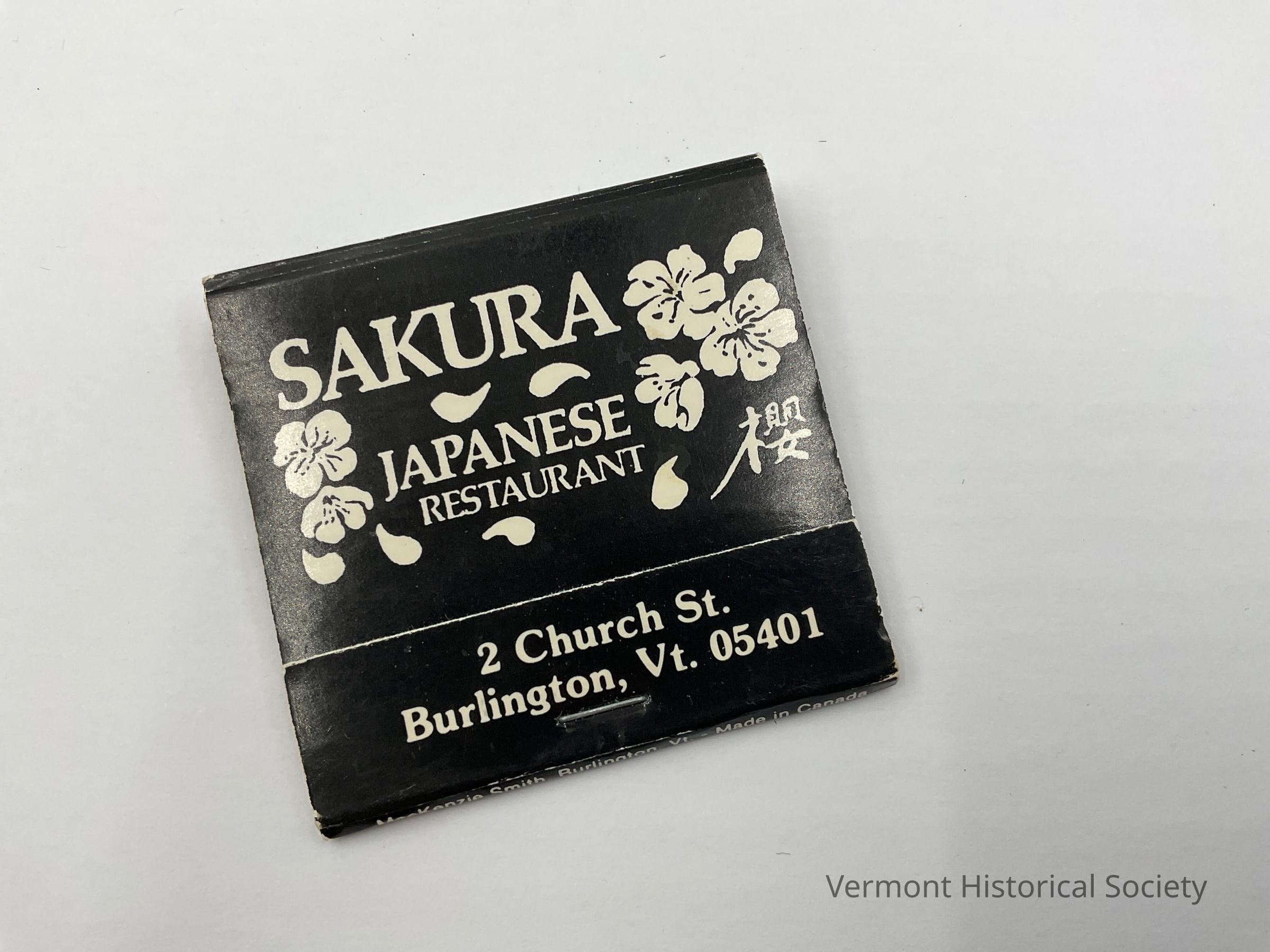 Black matchbook with the images of white flowers and Japanese writing plus the name, "Sakura Japanese Restaurant." At the bottom of the front flap is the warning, "Close Cover Before Striking." On the flap securing the white-tipped matches is the address -- 2 church St., Burlington, Vt. 05401. On the bottom edge, the producer or distributor is listed as "MacKenzie Smith, Burlington, Vt. - Made in Canada." The telephone number - 802-863-1988 - is written in white on the top edge. On the back cover is white lettering that says, " Traditional Japanese Cuisine."Context