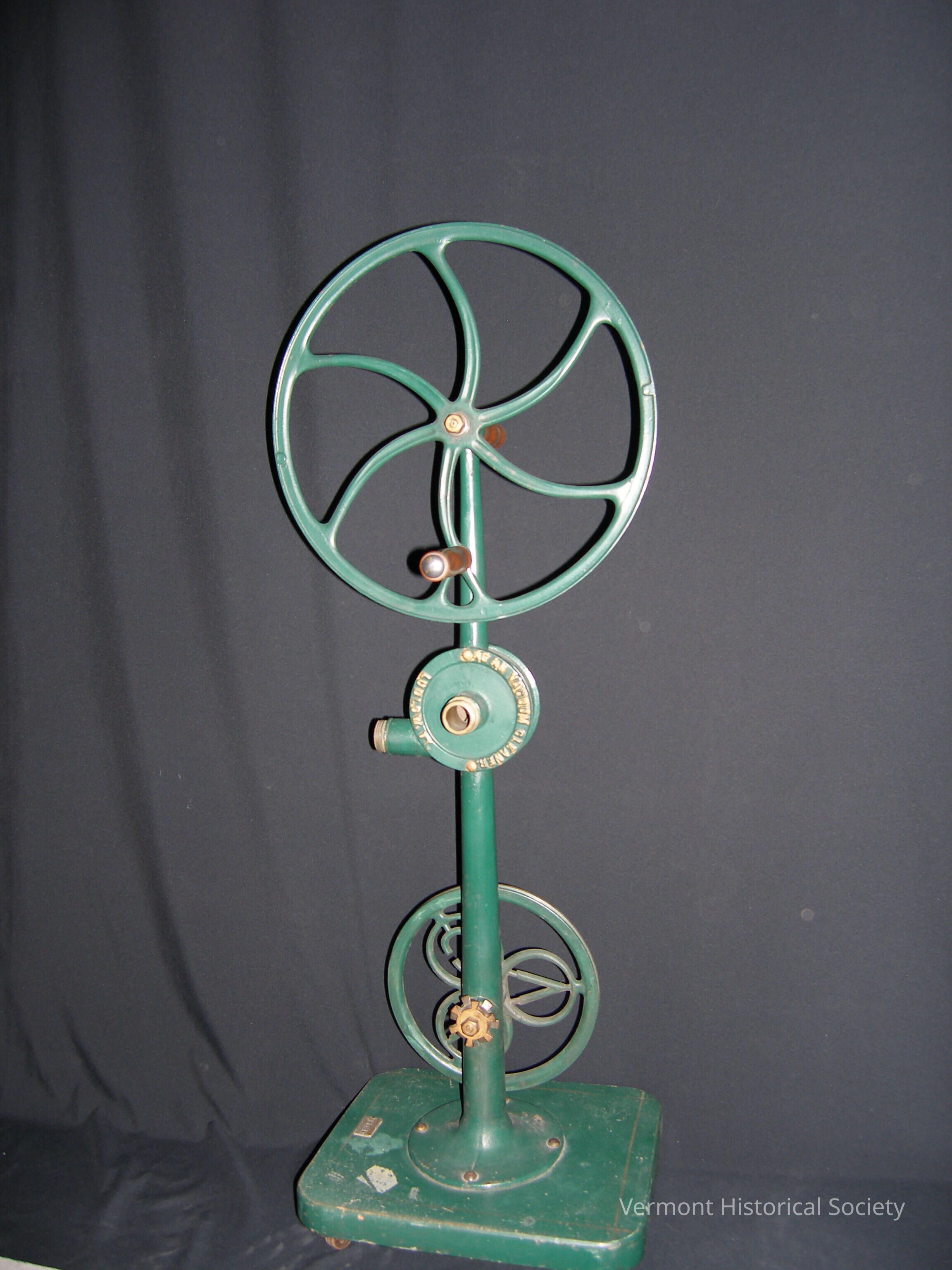 Hand-powered vacuum cleaner consisting of a metal pole with a large crank wheel at the top and small gear wheel at the bottom. There are two tube attachments (threaded like a hose spigot) at the center.