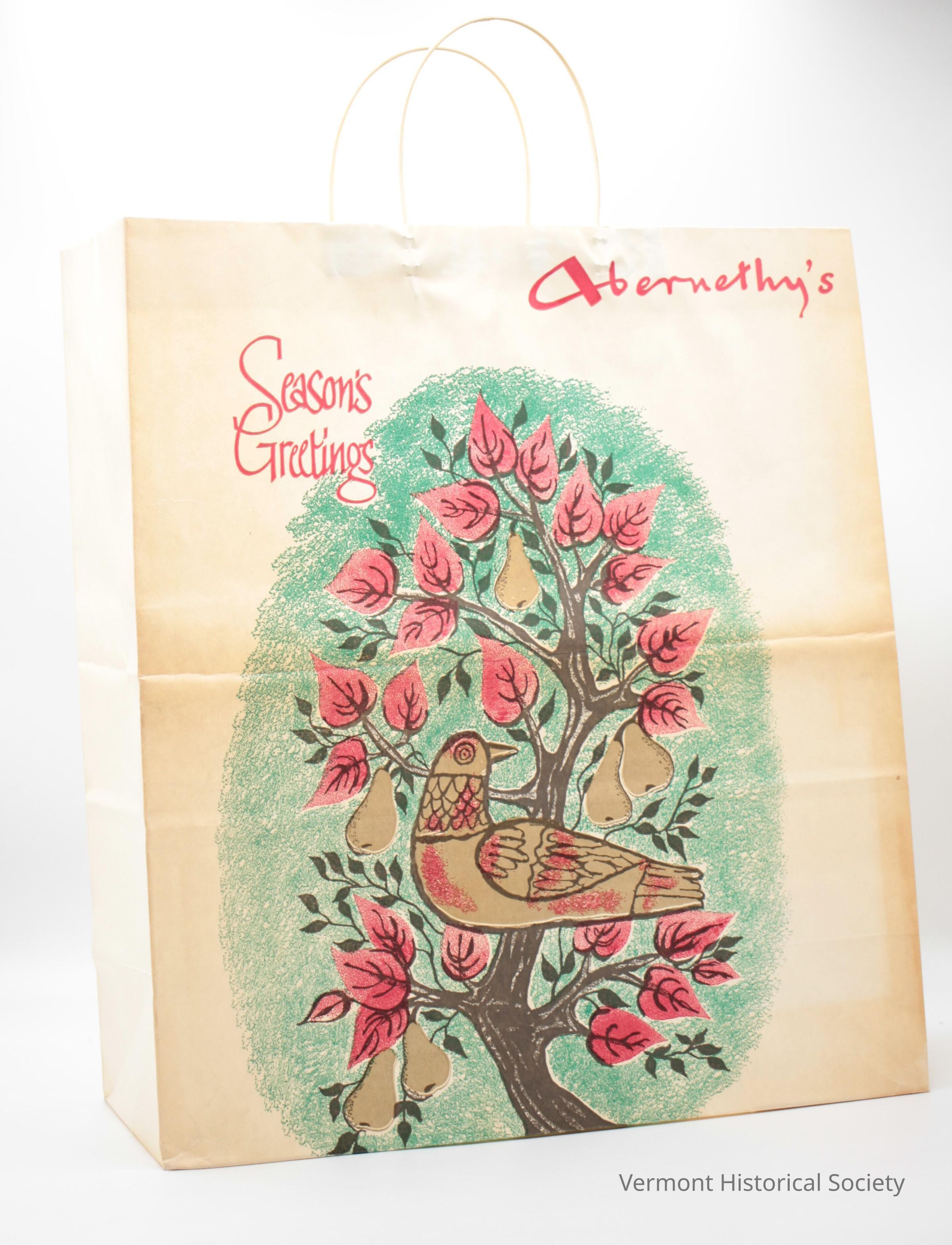 Large white paper shopping back with jute handles. The bag is printed with an illustration of a bird sitting in a tree that has brown pears and red leave, framed in a scribbled green oval. The words, "Season's Greetings" and "Abernethy's" are at the top of the bag.Context