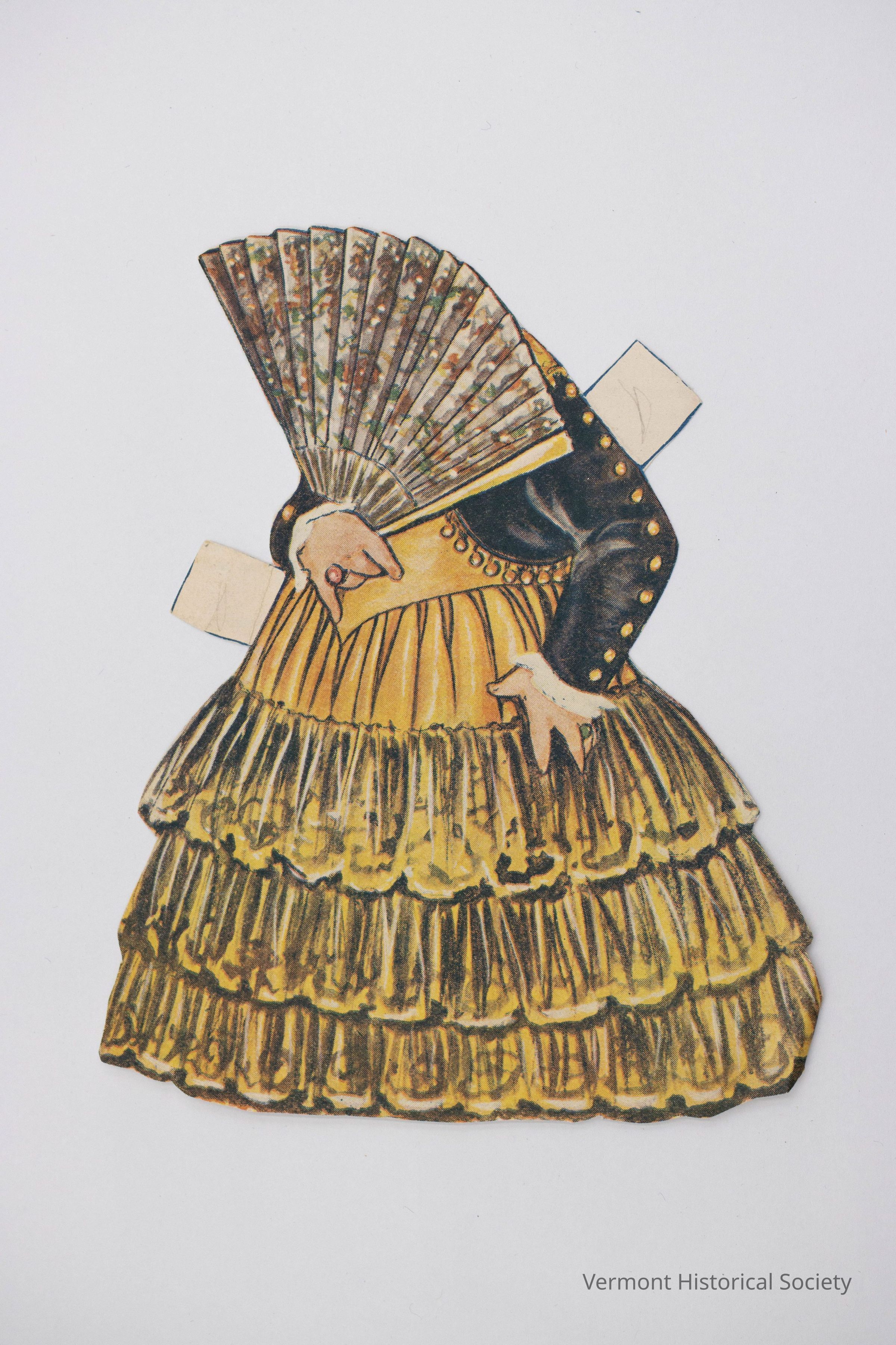 Printed paper dress for a paper doll. The dress consists of a short black jacket and a voluminous yellow skirt. One hand is holding a large folding fan. The back shows a portion of a sales catalog page.Context