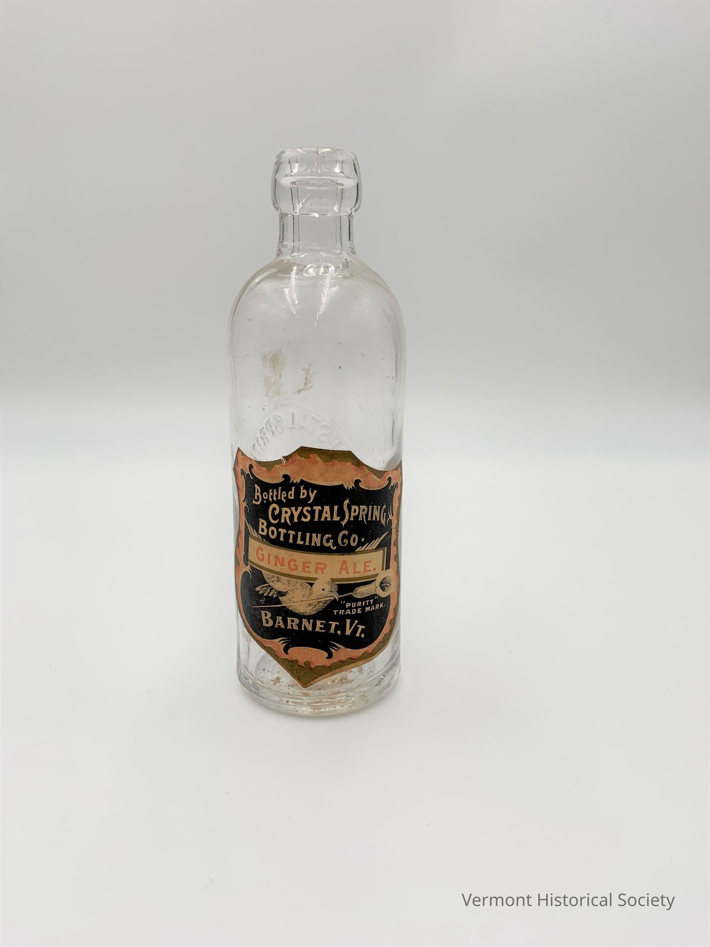 Clear glass soda bottle molded with the inscription, “CRYSTAL SPRINGS BOTTLING CO. BARNET, VT." on one side and a shield-shaped paper label on the other side that reads, "Bottled by CRYSTAL SPRINGS BOTTLING CO. / GINGER ALE / "PURITY" TRADE MARK / BARNET, VT."Acquisition