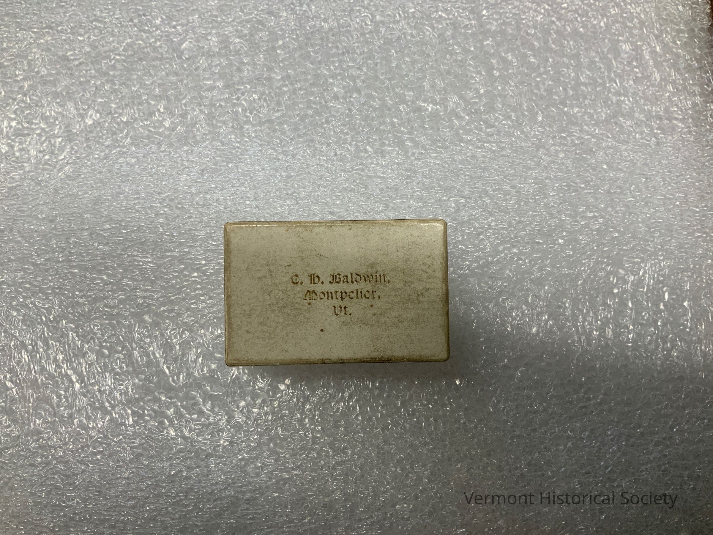 Small, rectangular cardboard ring box with a removable lid. The top of the lid is printed with the inscription, "C.H.Baldwin, Montpelier, Vt."Context