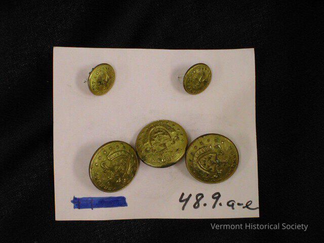 Five gold-toned buttons (three large and three small) bearing the insignia of the Fuller Batter, Vermont National Guard. The buttons each have a central shield with the Vermont state seal topped by a stag's head.