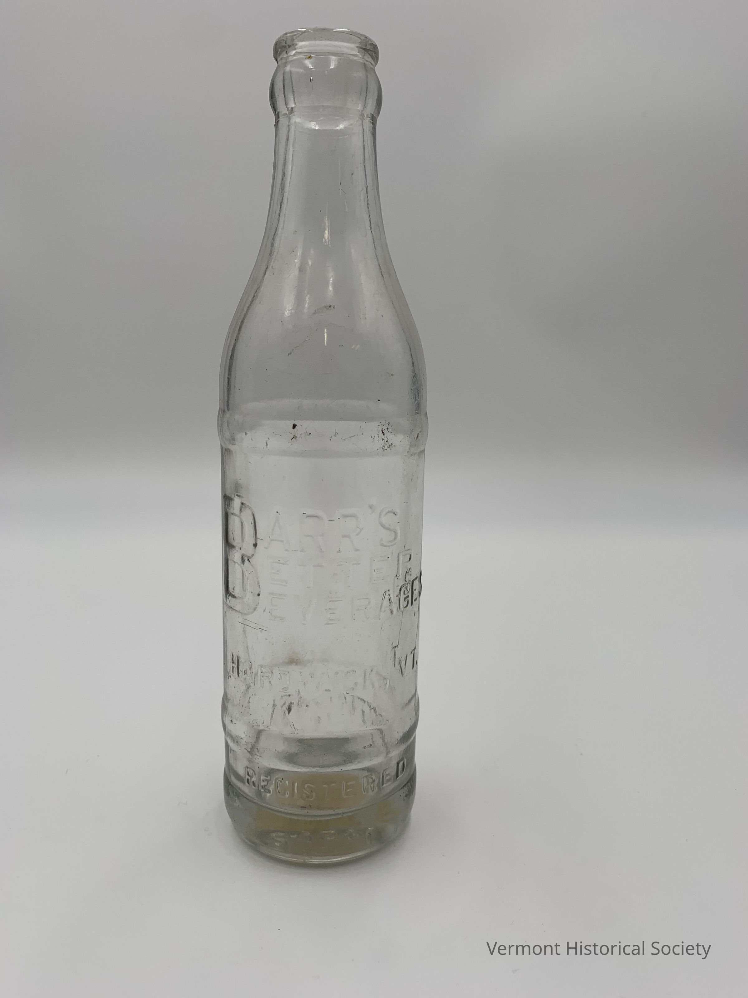 Clear glass soda bottle molded with the inscription, “BARR'S BETTER BEVERAGES HARDWICK, VT REGISTERED".