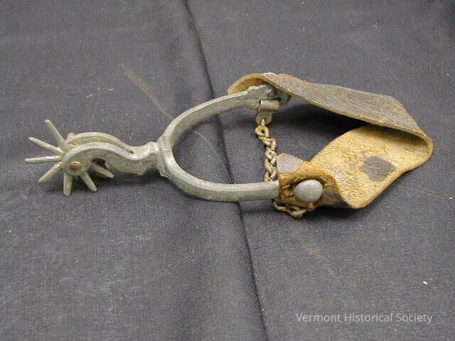 Silver-toned metal spur with attached leather strap. The spur consists of a U-shaped piece of metal with a two-pronged attachment at the center. Within the prongs is a round, freely-spinning piece of metal shaped into spikes (7 remaining). At the ends of the U-shaped piece, a strip of brown leather is attached with large rivets. The inner posts of the rivets are attached with a loose length of metal chain.