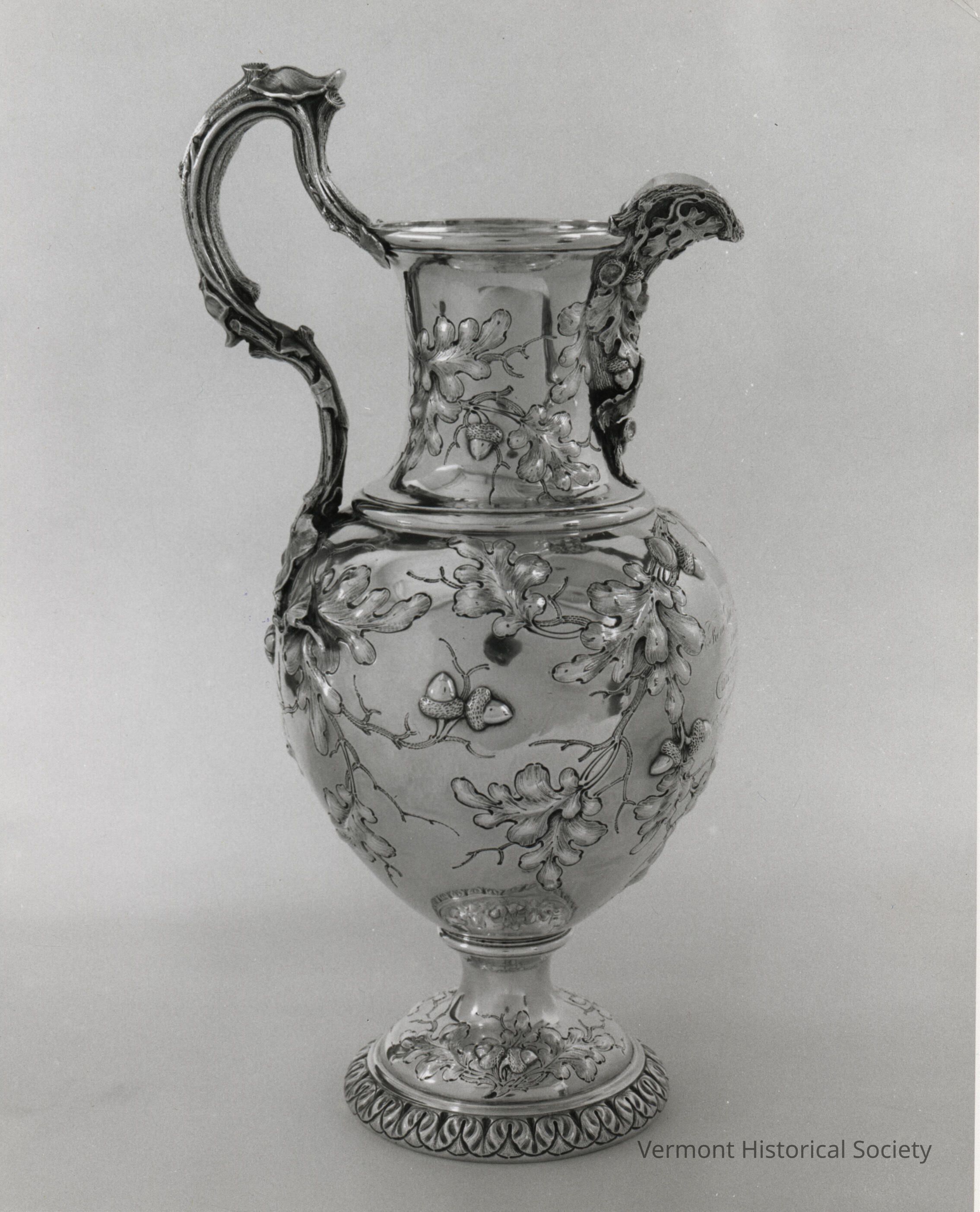 Large, ornate silver pitcher chased and engraved all over with oak leaves and acorns. The pouring spout is edged with a branch, and the high handle is in the shape of a vine-covered branch. The center front is engraved, "From the Ladies of Carlisle Pa. A Tribute of Gratitude to Brig Genl W.F. Smith for his noble defense of their homes on the night of the 1st of July, 1863."
