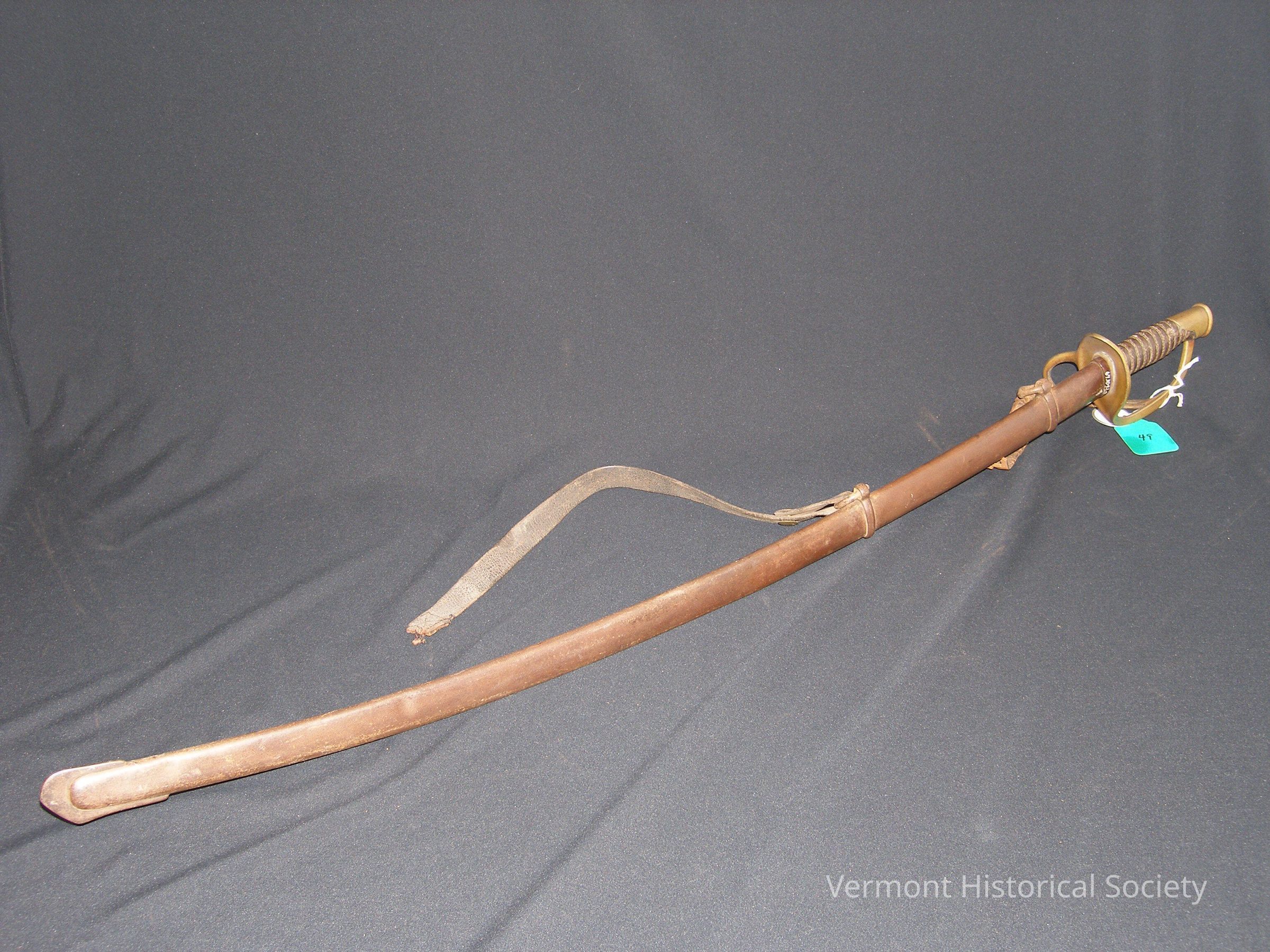 Slightly curved sword with leather scabbard. The grip is leather wrapped in twisted wire. the guard and pommel are bronze. The blade is marked on one side, "U.S. A. L", and on the other side, "AMES MFG CHICOPEE MASS."Context