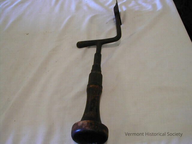 Hoof parer consisting of an L-shaped metal tool attached to a turned wooden handle. The handle ends in a round knob.