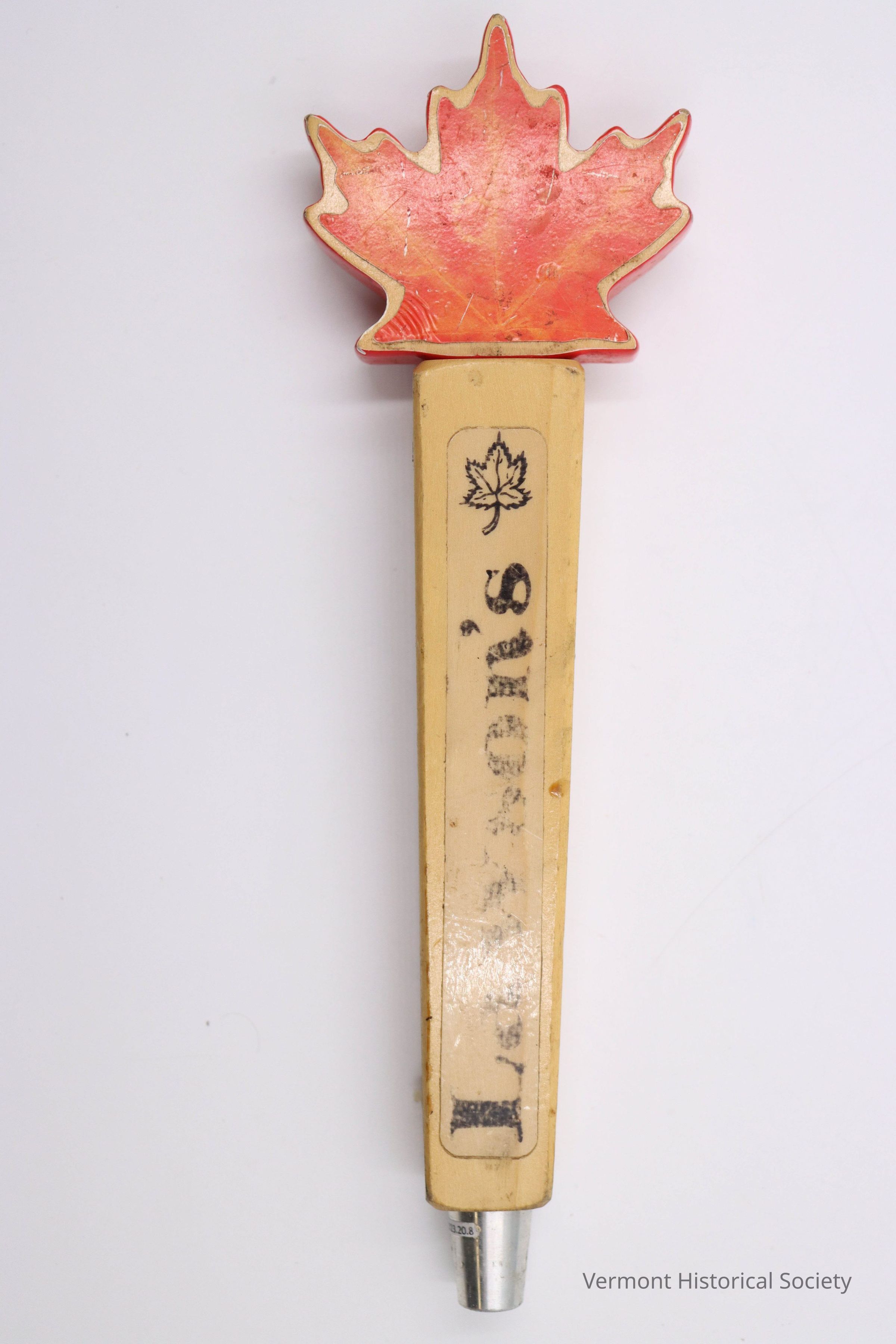 Wooden beer tap with a rotatable wooden disk on the top. There is a sticker on the disk printed with an image of a maple leaf. The shaft of the tap has a sticker on each side printed with the label "Lawson's" on 2 sides and "Finest Liquids / WARREN, VT" on 2 sides. There is a metal socket at the base for attachment.