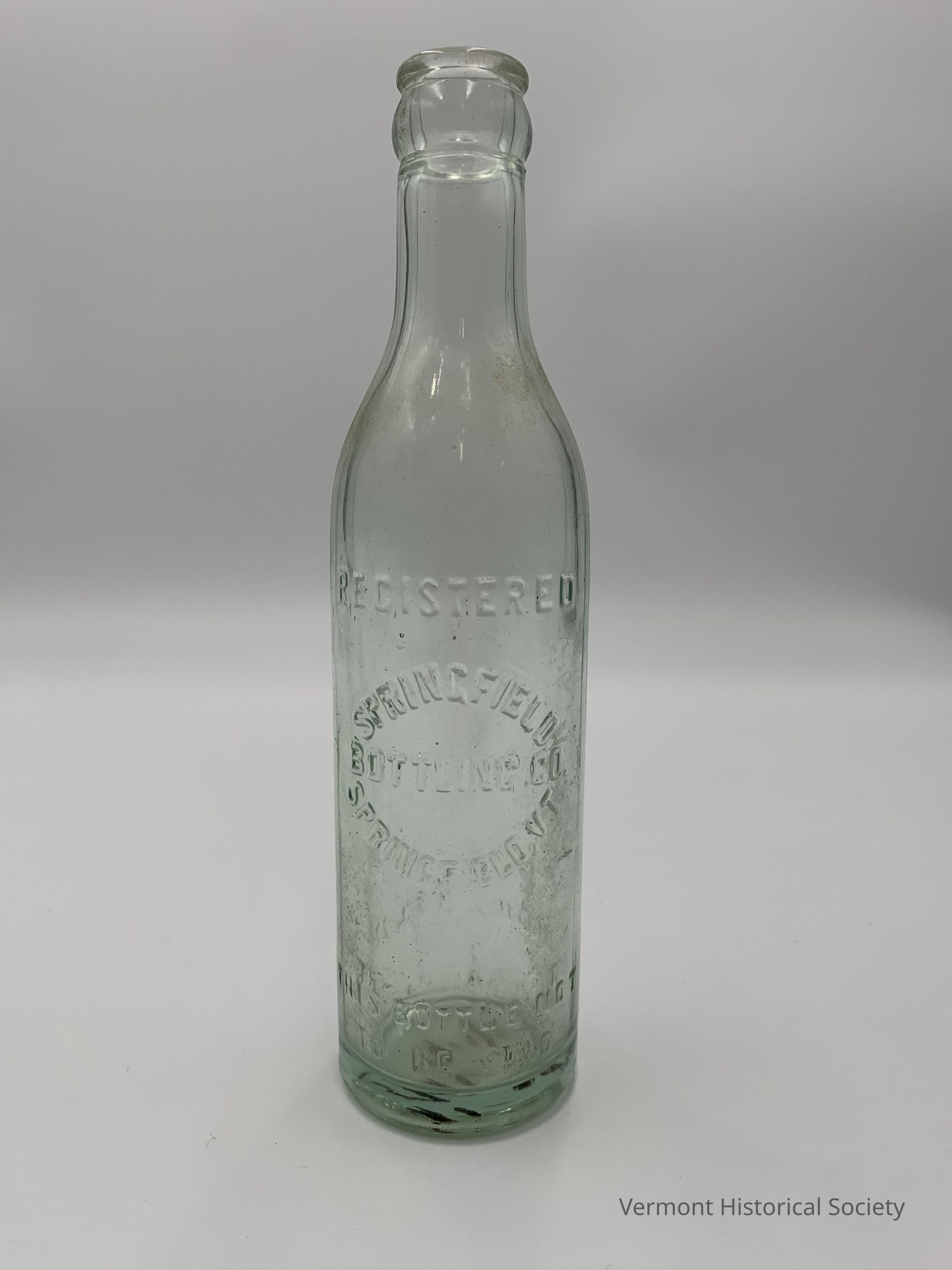 Clear glass soda bottle molded with the inscription, “REGISTERED SPRINGFIELD BOTTLING CO. SPRINGFIELD, VT."