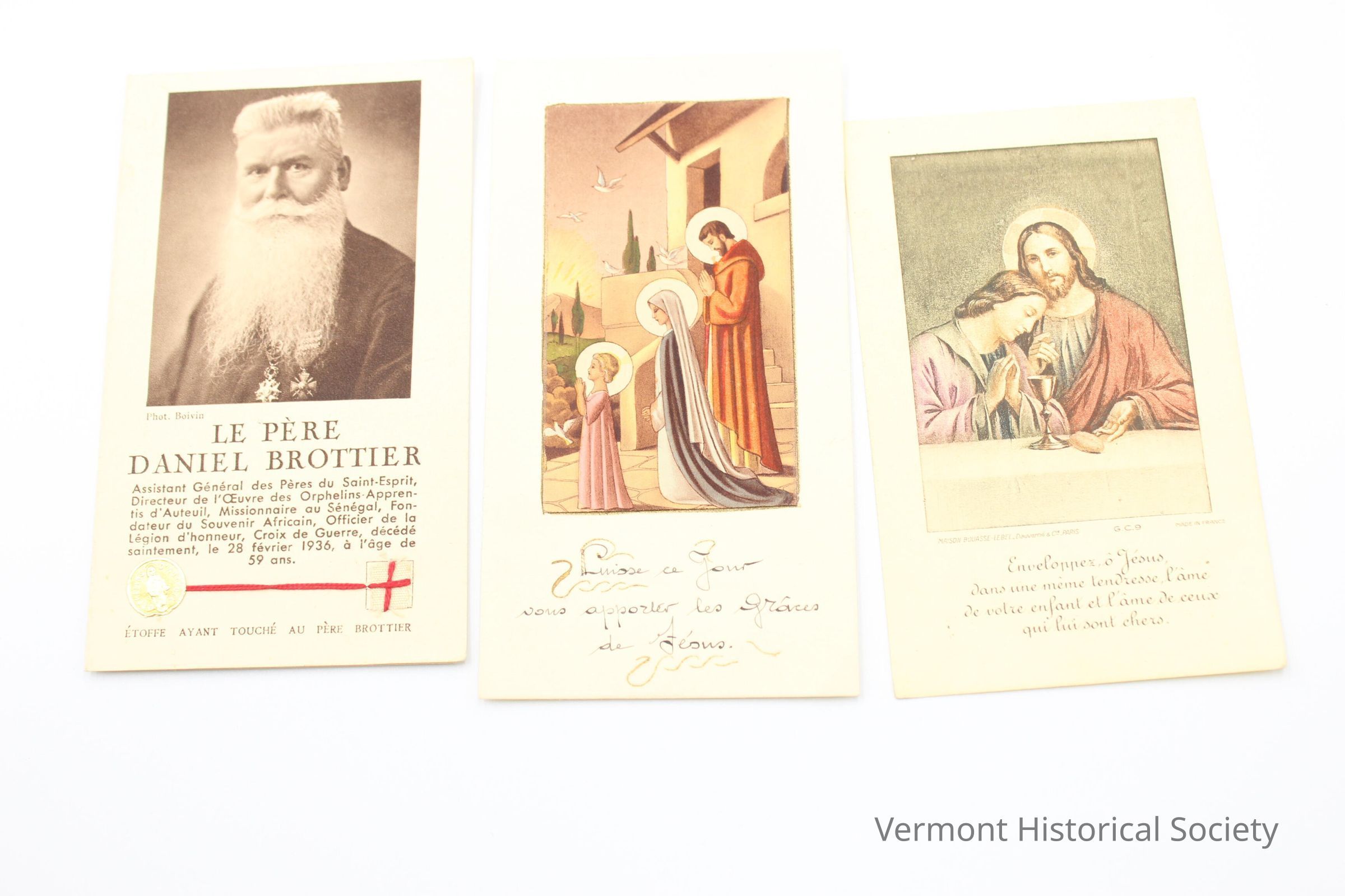 One shows a priest and has what is said to be a snip from a piece of material that he touched. Another show three people praying and has a message of friendship handwritten on the back from Marie Louise and Emile Lagache.