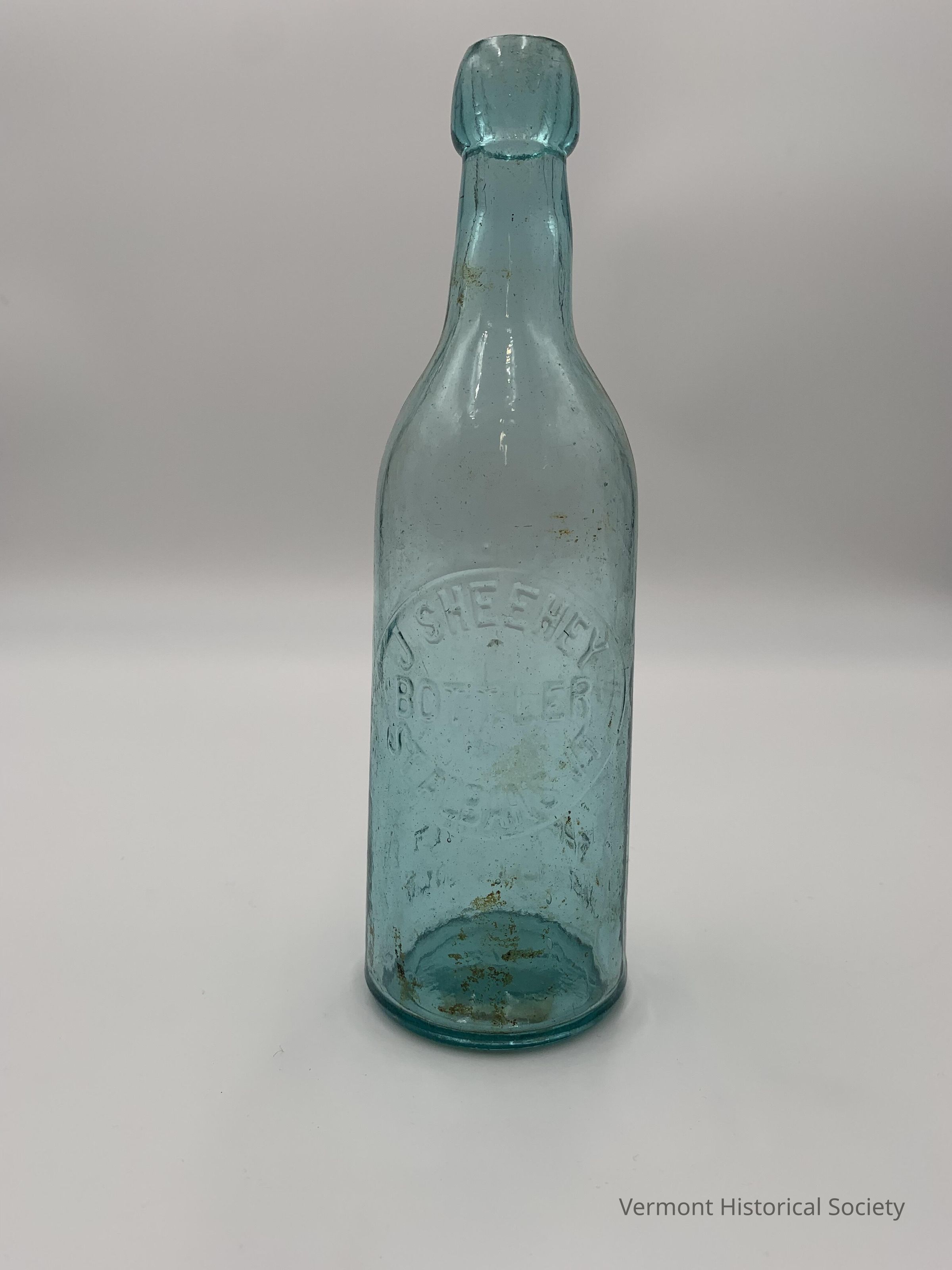Green glass soda bottle molded with the inscription, "J SHEEHY BOTTLER ST. ALBANS, VT."