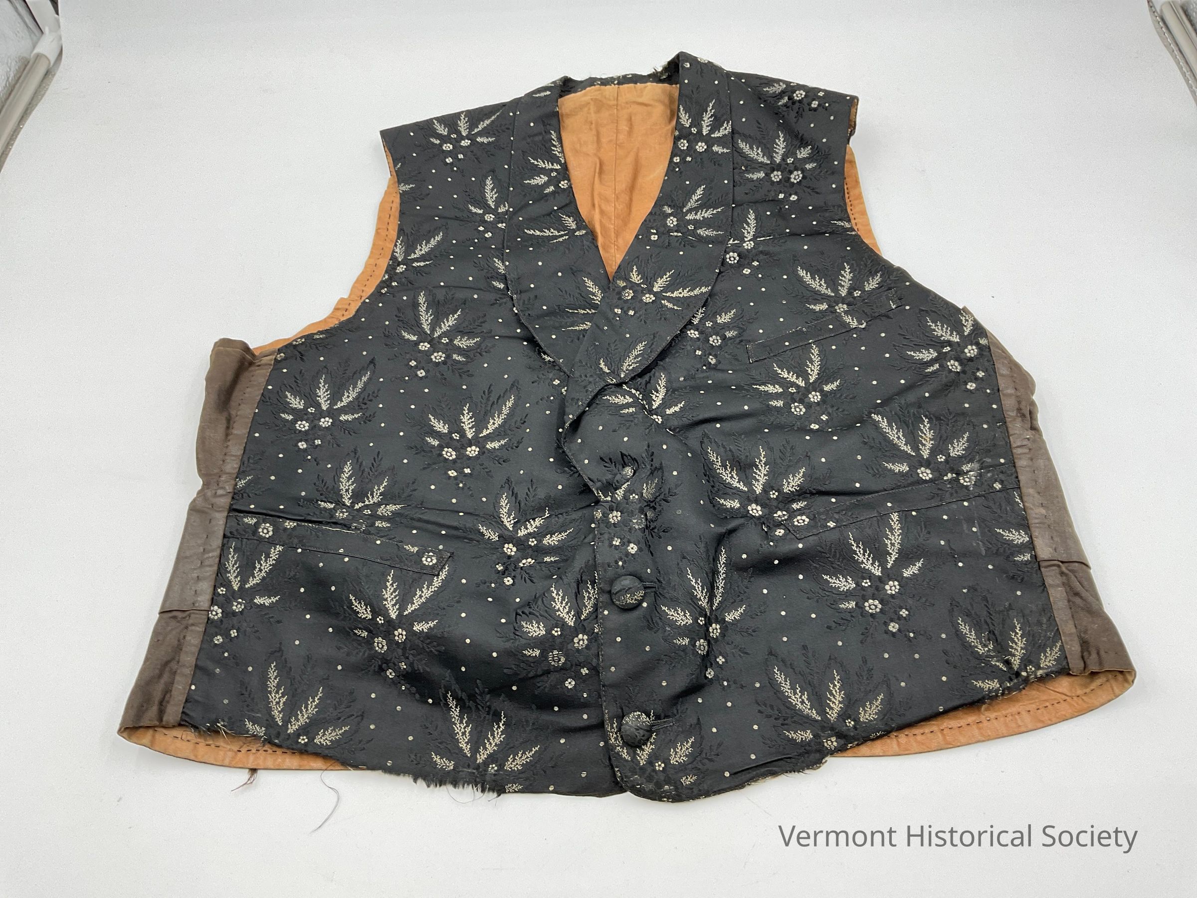 This man's vest has front panels made of black silk brocade with a design featuring flowers, leaves, and interspersed dots in white. It boasts three welt pockets for and rounded lapels. The lining of the vest is crafted from light brown cotton, while the back is made of dark brown glazed cotton. There is a strap with a metal buckle positioned horizontally across the back waist, allowing for fit adjustment.Context