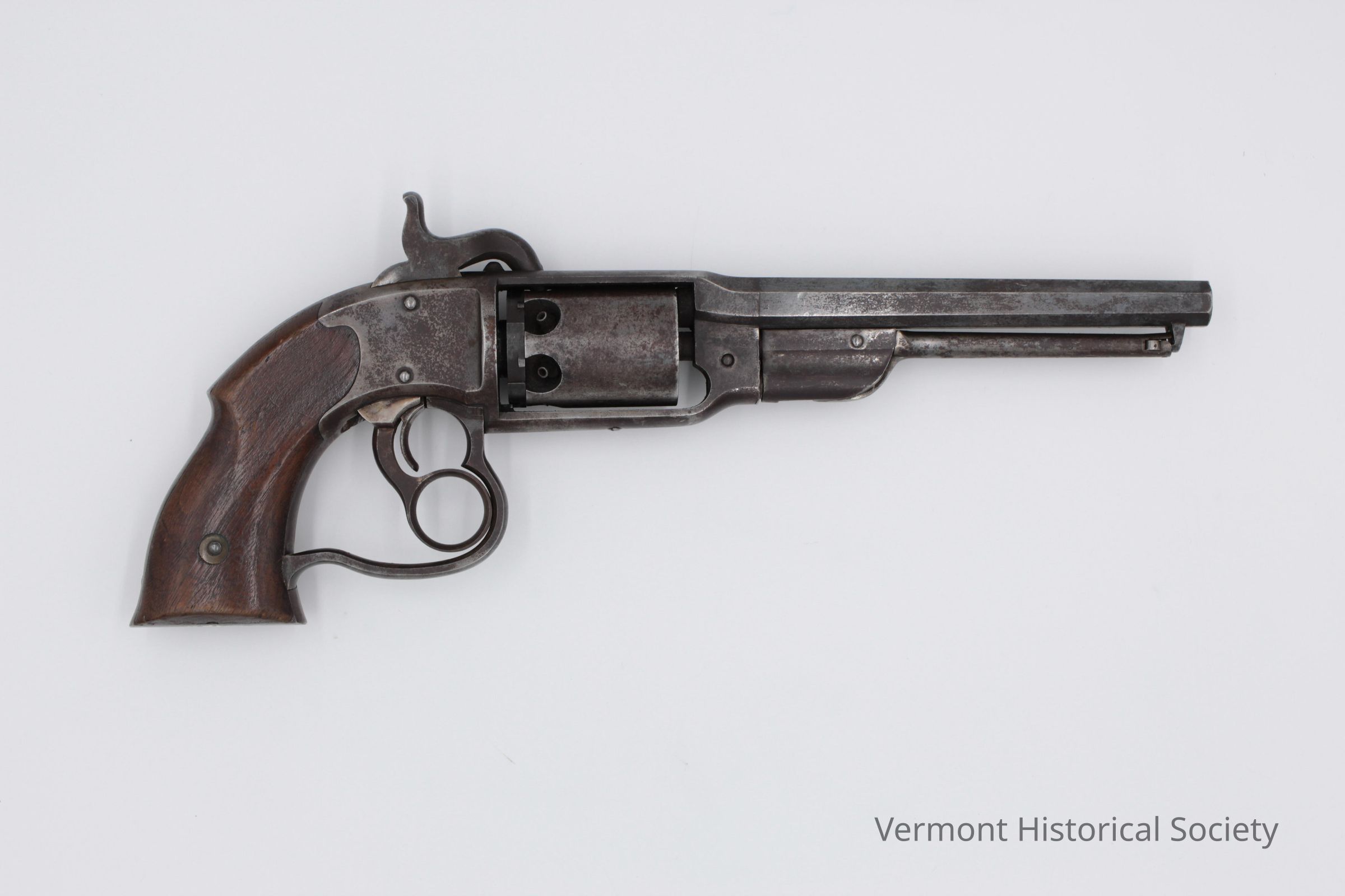 Six-chambered revolver with rifled bore. The chambers have external cap nipples, one of which is missing. The gun has two triggers. The larger, lower trigger cocks the hammer and rotates the cylinder; the upper trigger fires the gun. The letters "HM" are stamped into the cylinder. The top of the lock is engraved, "Savage R.F.A. Middletown. CT/ H.S. North Patented June 17 1856/ January 18 1859 May 15 1860"Context