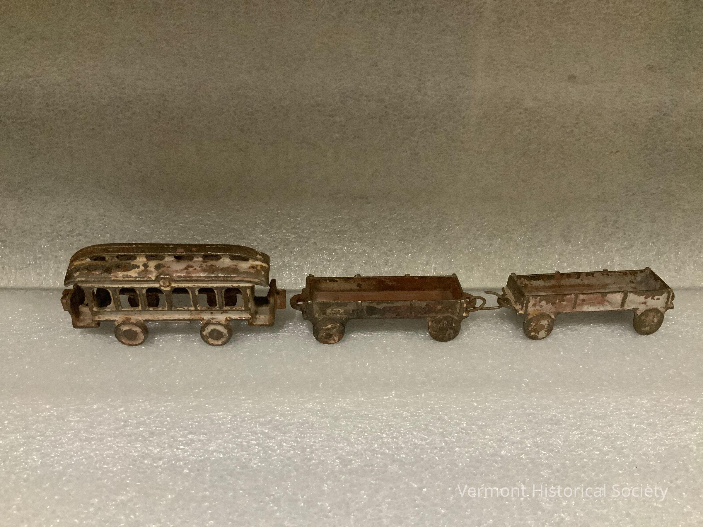 Three cast-iron toy train cars consisting of a passenger car and two flat bed cars. Each car has a loop on either end for connecting. The flat cars are connected with a metal wire bent through the loops.Context