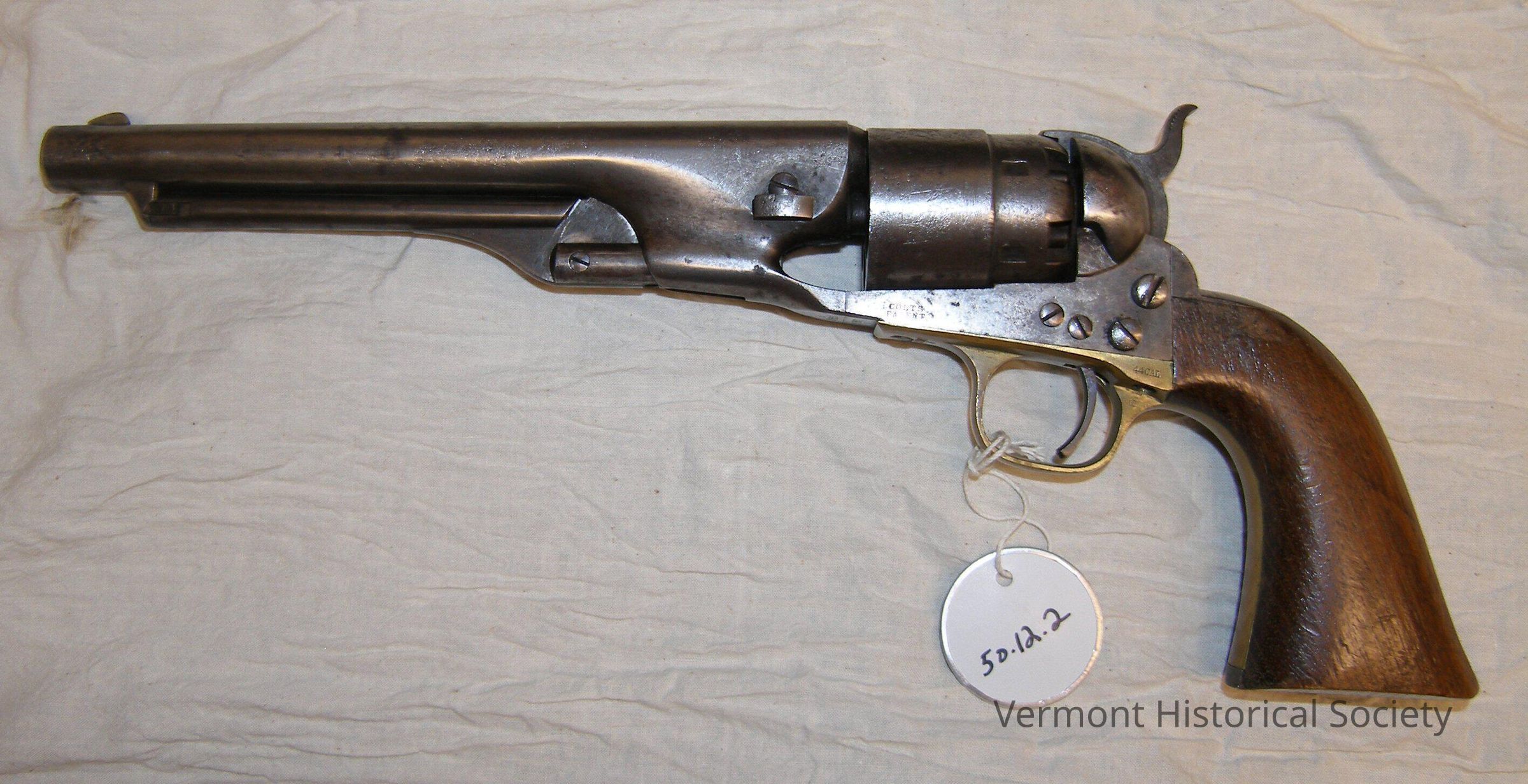 A Colt single-action, six chambered revolver. The chamber, barrel, and lock are all made of steel, the handle is woodenk and the trigger guard is made of brass. There is the serial number "20650" stamped on multiple pieces of the pistol. There is also the maker's mark, "Address Col. Saml. Colt New-York U.S. America" stamped on the cylinder. The cylinder is also engraved with several ships that are very faded.Context