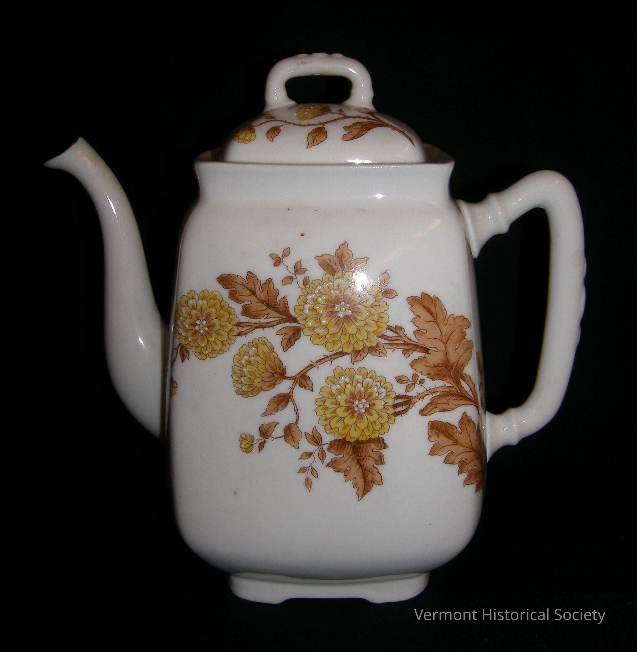 White porcelain coffee pot decorated with a brown and yellow design of stylized autumn flower. The handles of the pot and lid are formed to resembler bamboo.