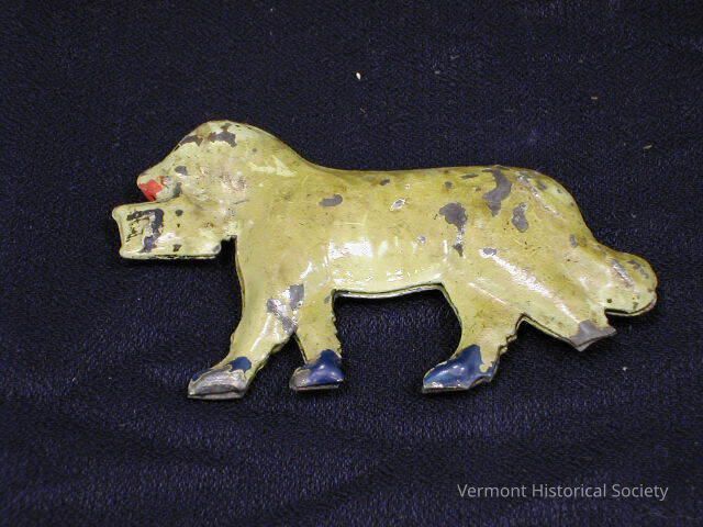 Painted metal dog, made of two pieces of tin connected around the edges. The dog is holding a bucket.Context