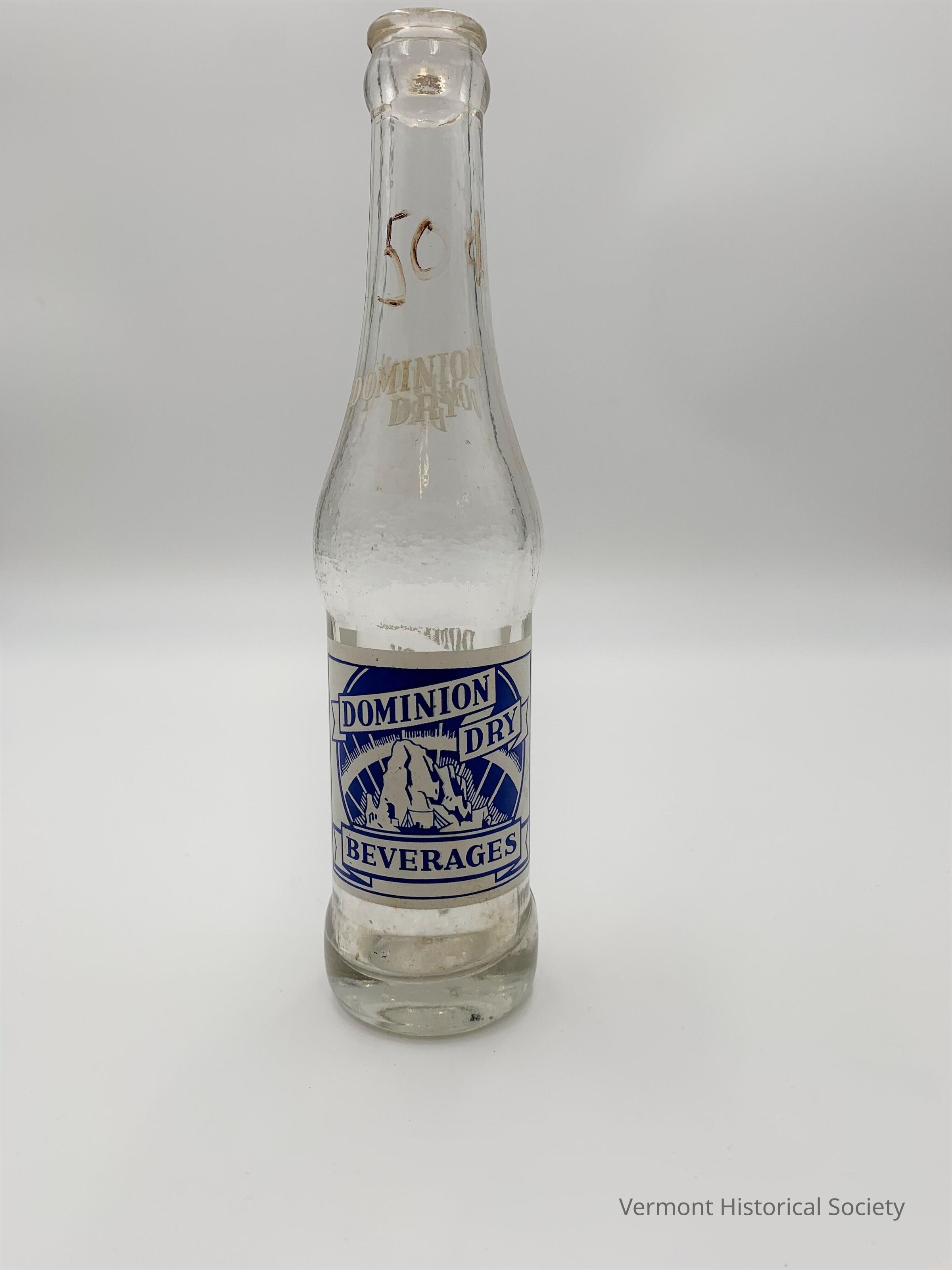 Clear glass soda bottle with a printed label. The label reads, "DOMINION DRY BEVERAGES" around an image of a glacier or rocky mountain with a pup tent at the base. The words, "DOMINION DRY", are printed twice on either side of the neck. The price 50 cents is written in ink on the neck.Acquisition