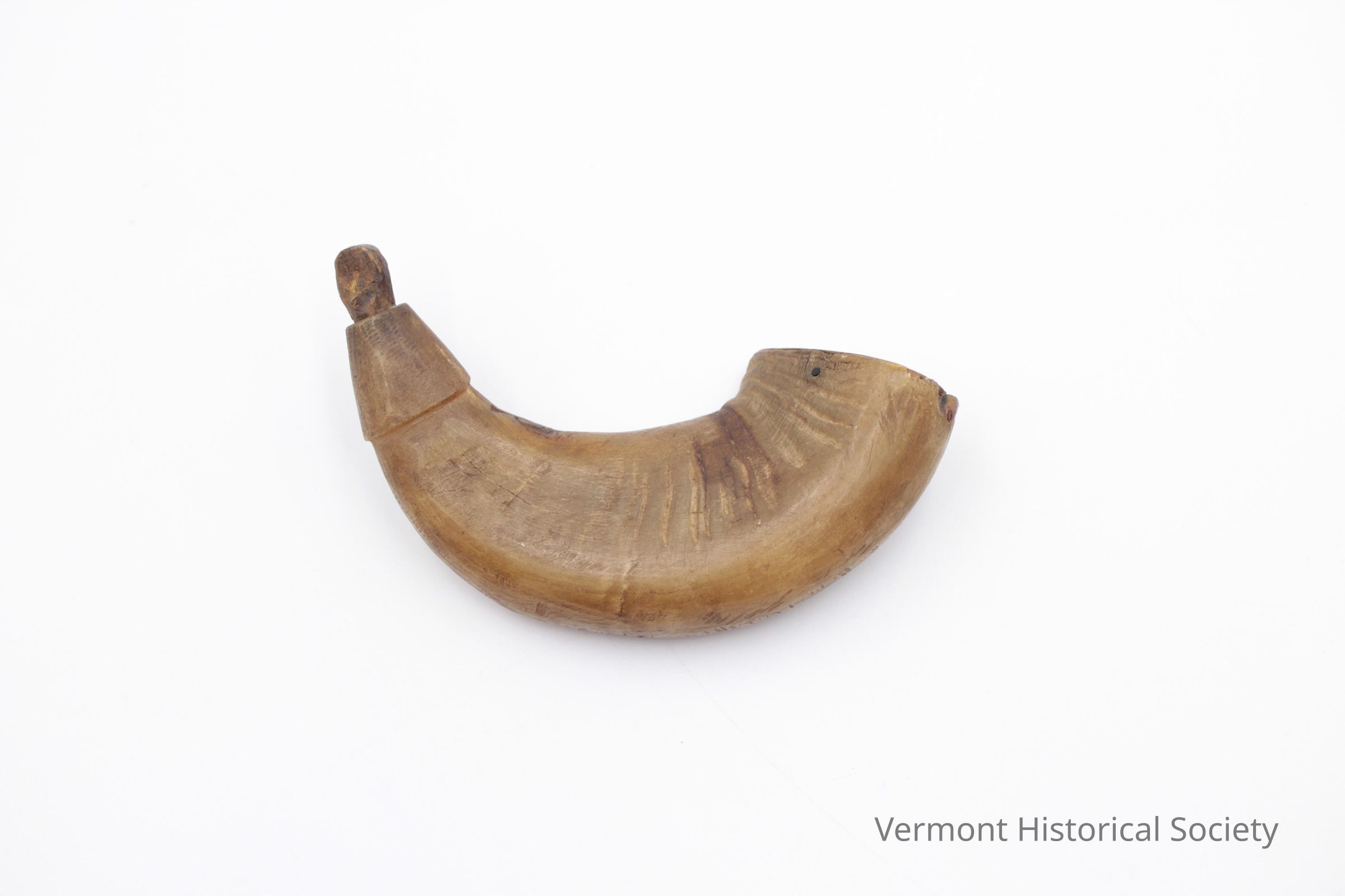 Small powder horn made from a curved ram's horn. The wide end is plugged with a wooden stopper secured with nails. The narrow end is plugged with a removable wooden stopper.