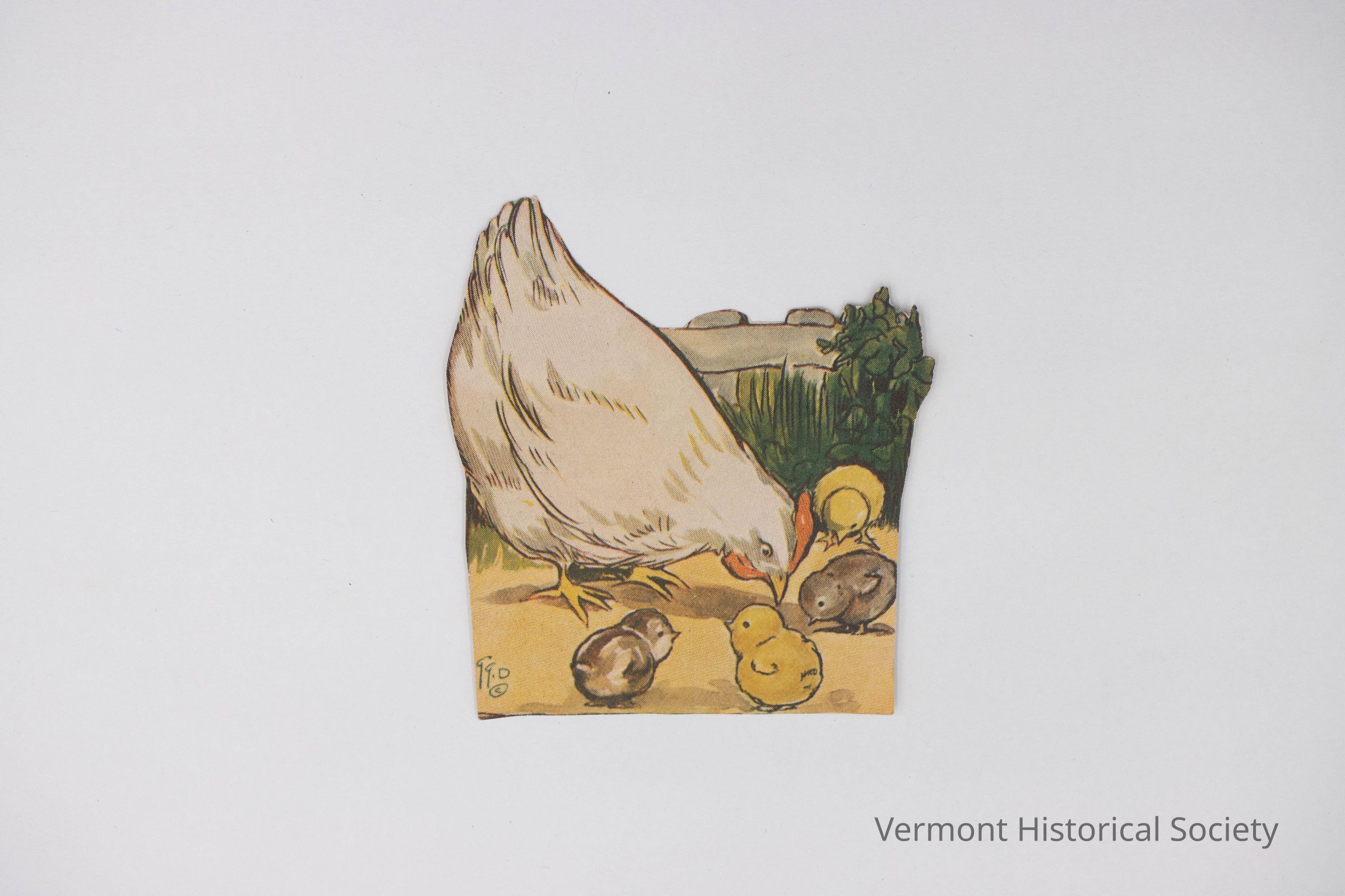 Printed paper doll showing a white hen, two yellow chicks, and two brown chicks. The back shows a portion of a page of a sales catalog.Context