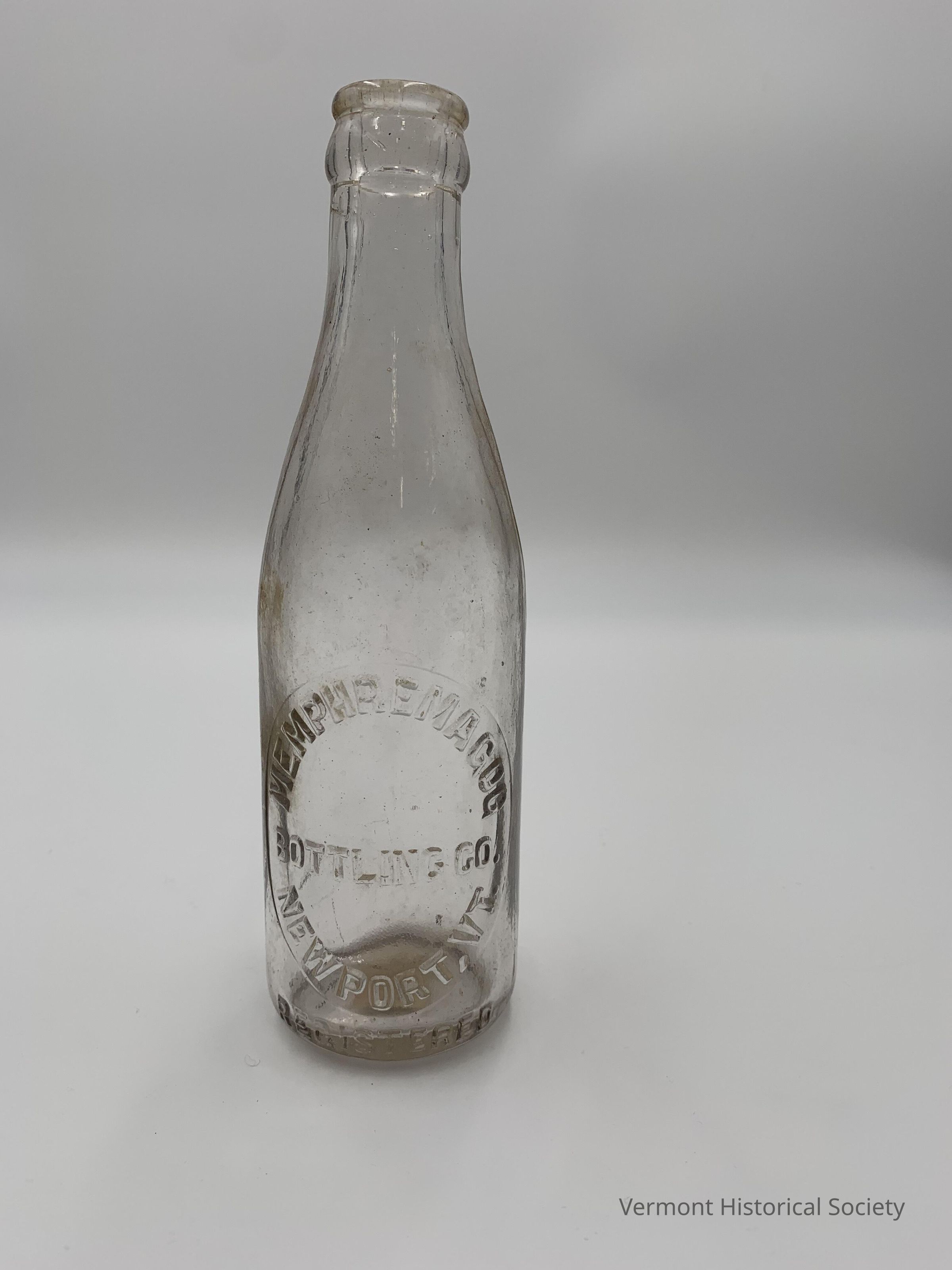 Clear glass soda bottle molded with the inscription, “MEMPHREMAGOG BOTTLING CO. NEWPORT, VT."