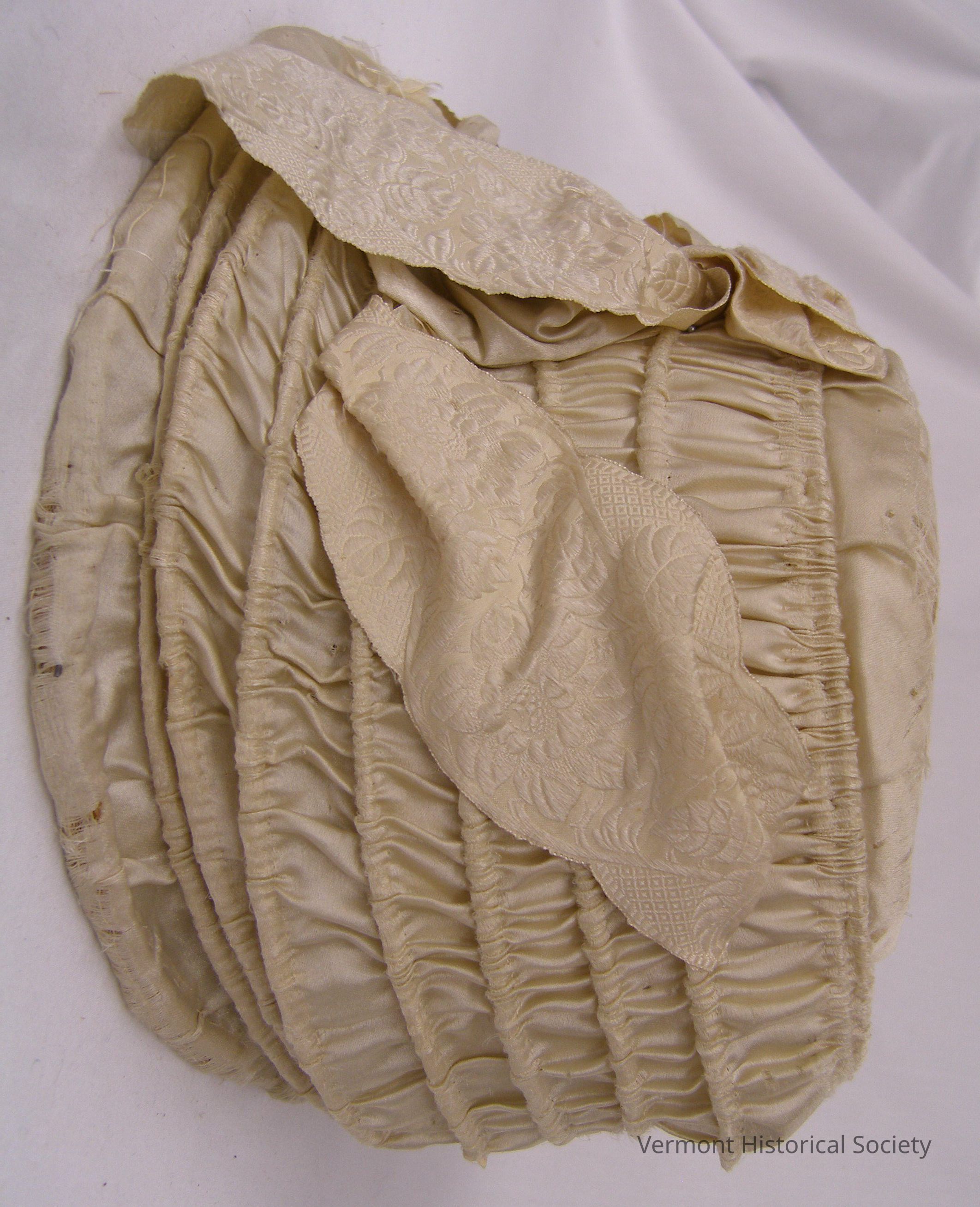 Cream colored silk bonnet. The brim of the bonnet is reinforced with several rows of reeds, which are ruched into the fabric, giving the brim structure. It is decorated with a large bow of floral silk. The interior is partially lined with satin on the brim, and no lining at the ground.Context