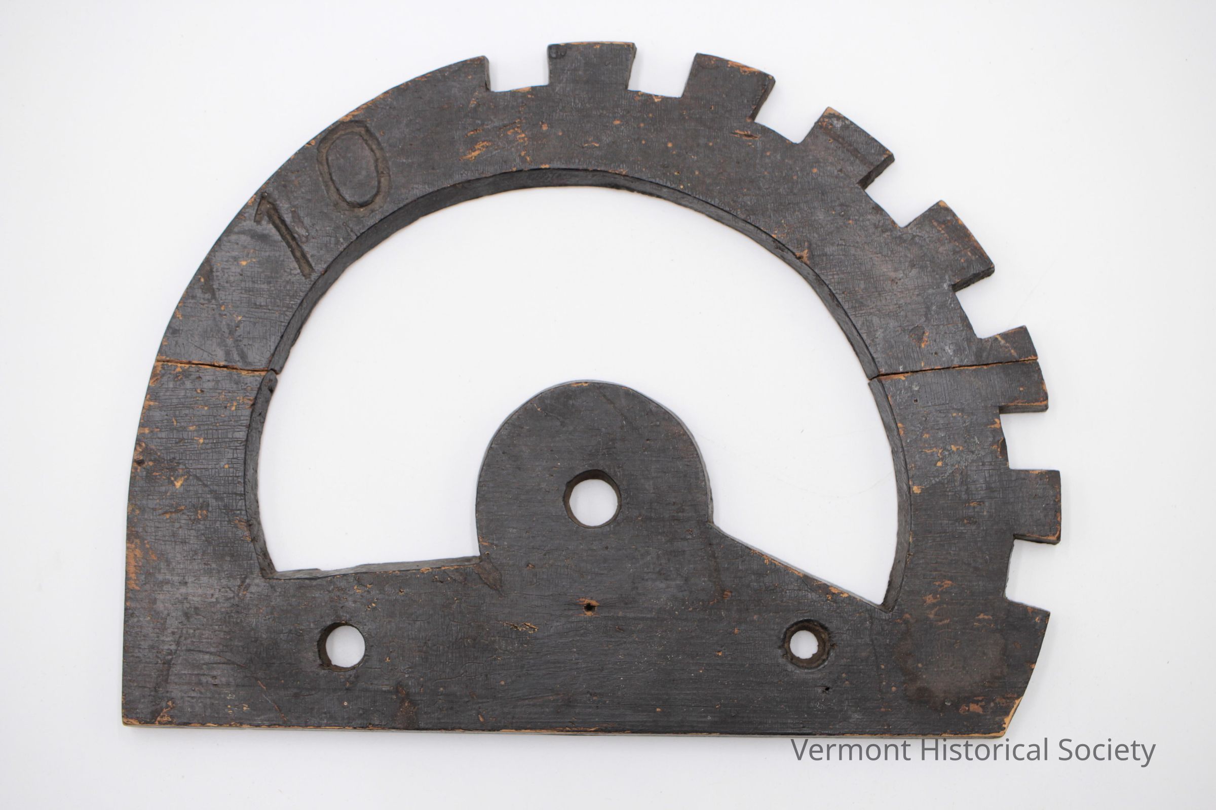 Wooden pattern in the shape of a half circle. A portion of the circular edge is notched to create a gear. The number "10" is carved into the side of the pattern.